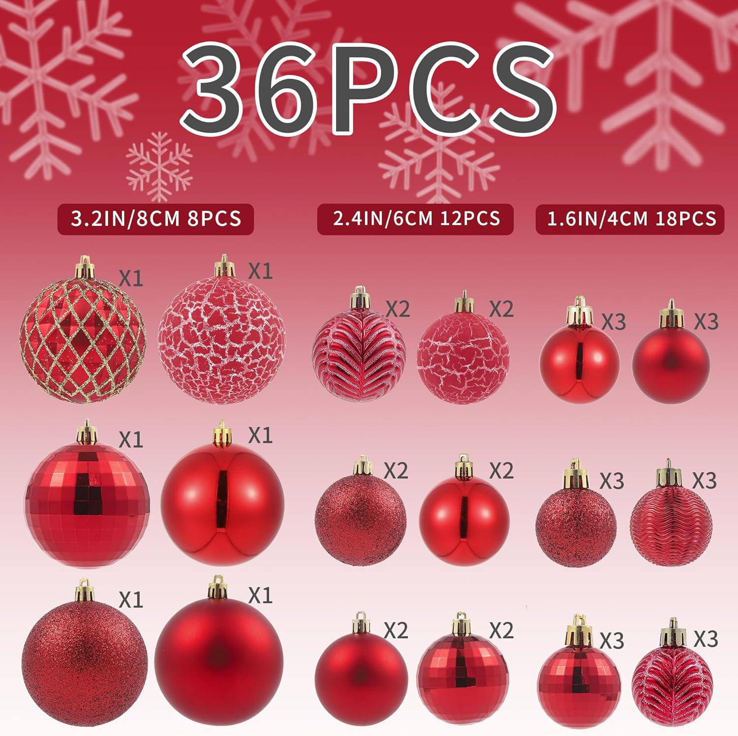 • Multiple Style Matching - With 3 sizes and 18 different styles, the LANGXUN Copper Orange Christmas ornaments balls set includes a total of 36 balls. This set features 8 balls measuring 3.2 inches, 12 balls measuring 2.4 inches, and 18 balls measuring 1.6 inches.