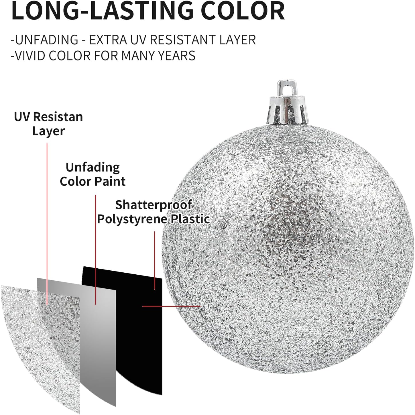 • Premium Quality - Crafted from thick and durable material, all our Christmas balls are made to last. Each ornament includes a high-quality plastic hanger to ensure they stay vibrant and shiny throughout the holiday season. Uv protection, indoor and outdoor use.