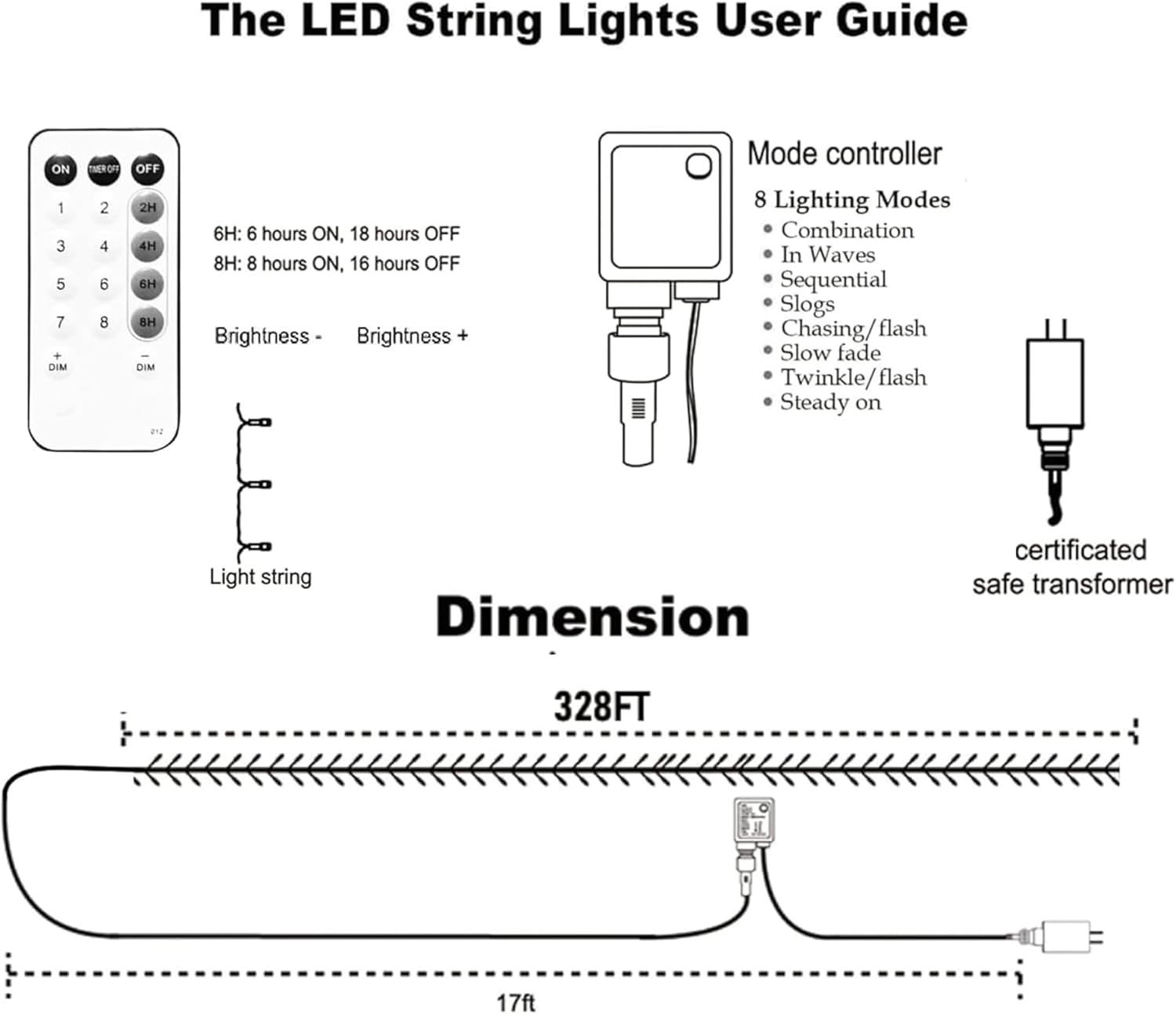 • Remote Control: The Christmas string lights can be controlled with wireless remote, you can set different, modes, timer, brightness, etc. There are 8 lighting modes (combination, in waves, sequential, slo-glo, chasing/flash, slow fade, twinkle/flash, steady on). It also has 4 timer modes, "2H" (2 hours on/22 hours off), "4H" (4 hours on/20 hours off), "6H" (6 hours on/18 hours off), "8H" (8 hours on/16 hours off).