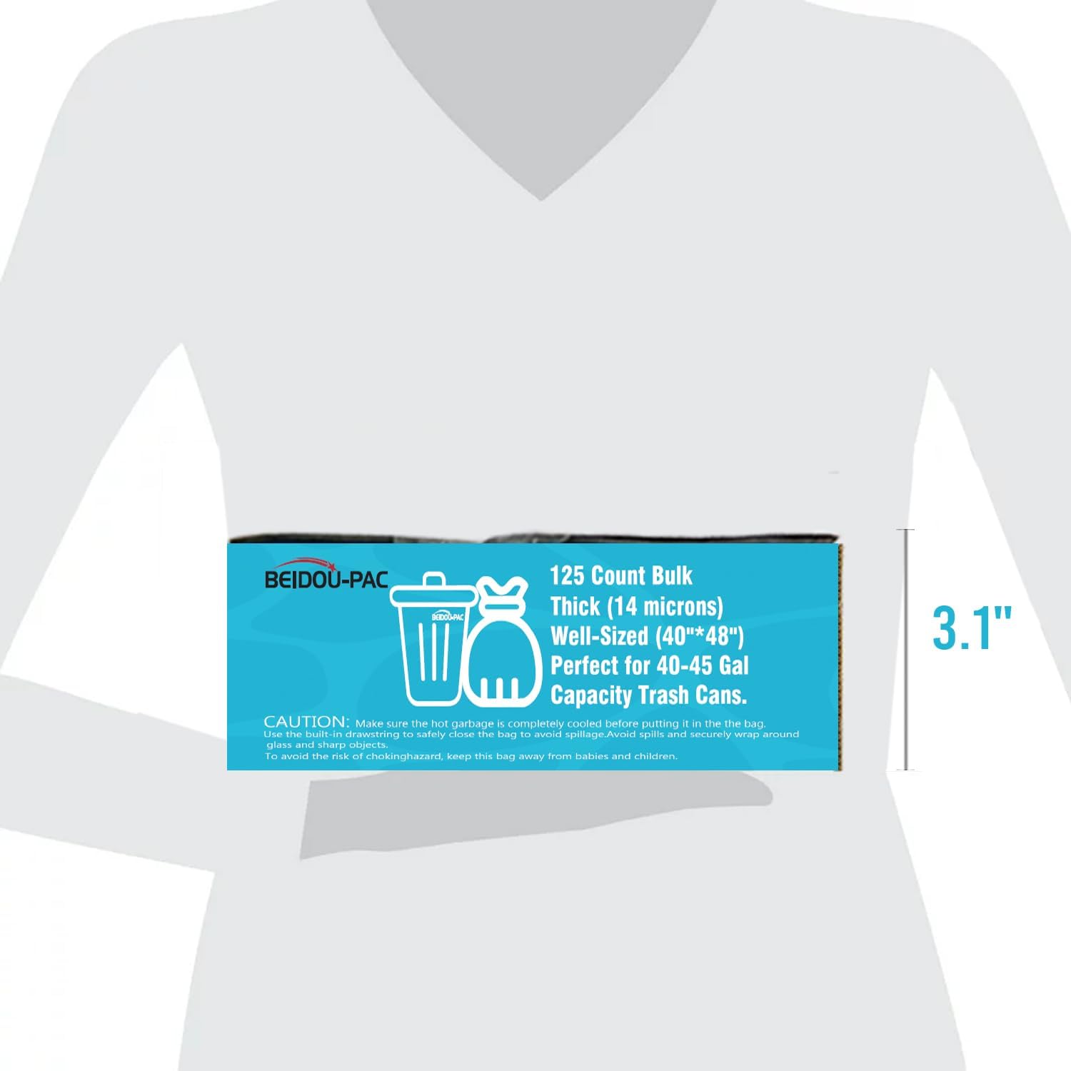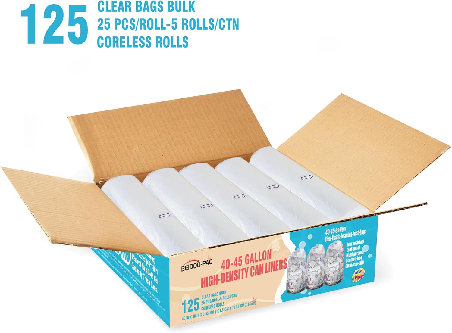 • 1, Product information: BEIDOU-PAC 40-45 gallon large clear plastic recycling trash bags, Size: 40" x 48"x 14 mic, Total 125 clear bags bulk (25 PCS/ROLL, 5 CORELESS ROLLS/CTN), Perfect for 40-45 Gal Capacity Office, commercial, industrial, or residential waste.