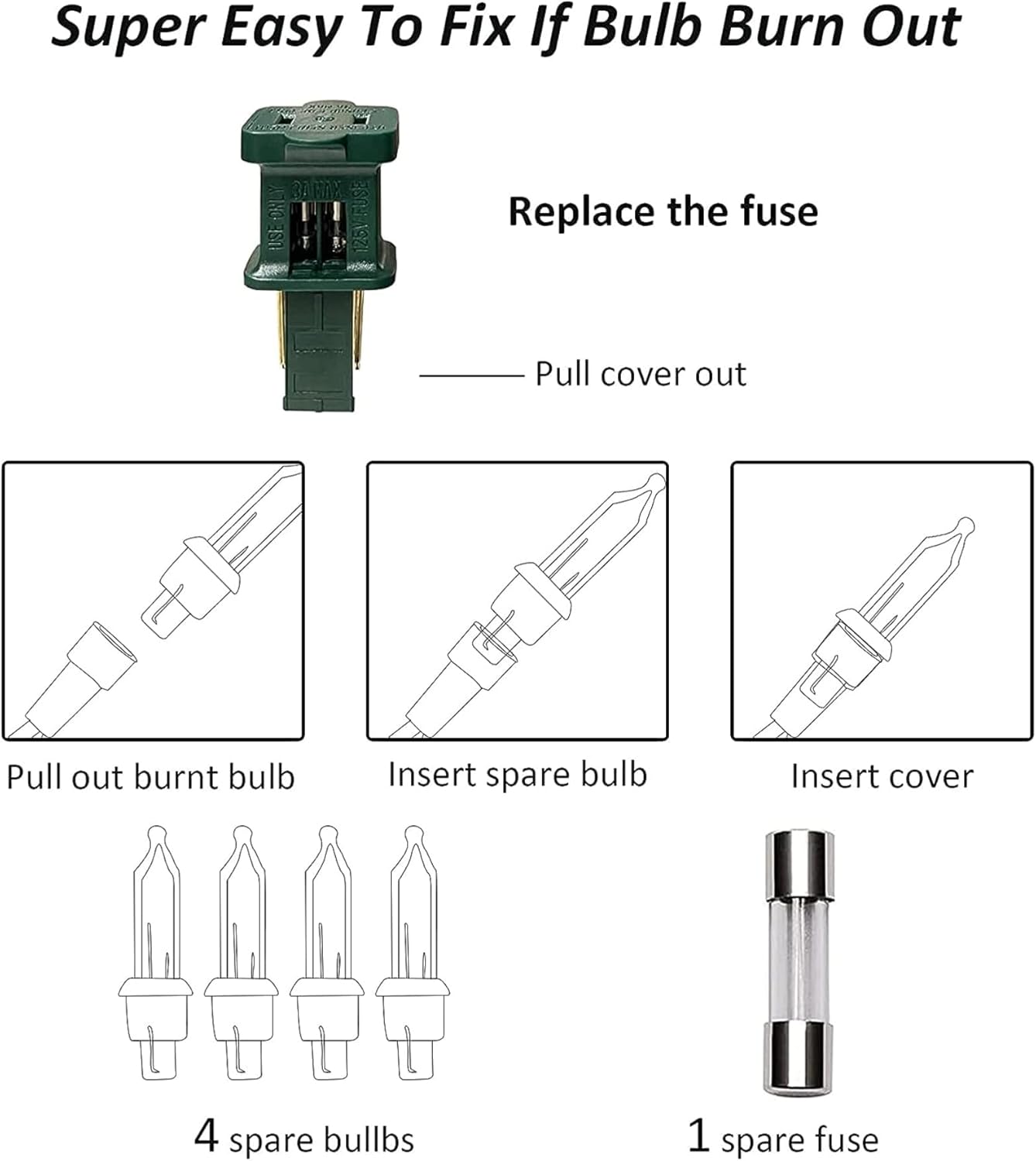 • Christmas Mini String Lights: The Christmas mini string lights includes 100 count incandescent light bulbs, the total length is 20 ft, the length of string light is 18.5 ft, lead wire is 1.5 ft, spacing between each light is 2.25 inches. Package Includes: 1 x 20 ft light string, 1 x spare fuse, 4 x additional incandescent bulbs.