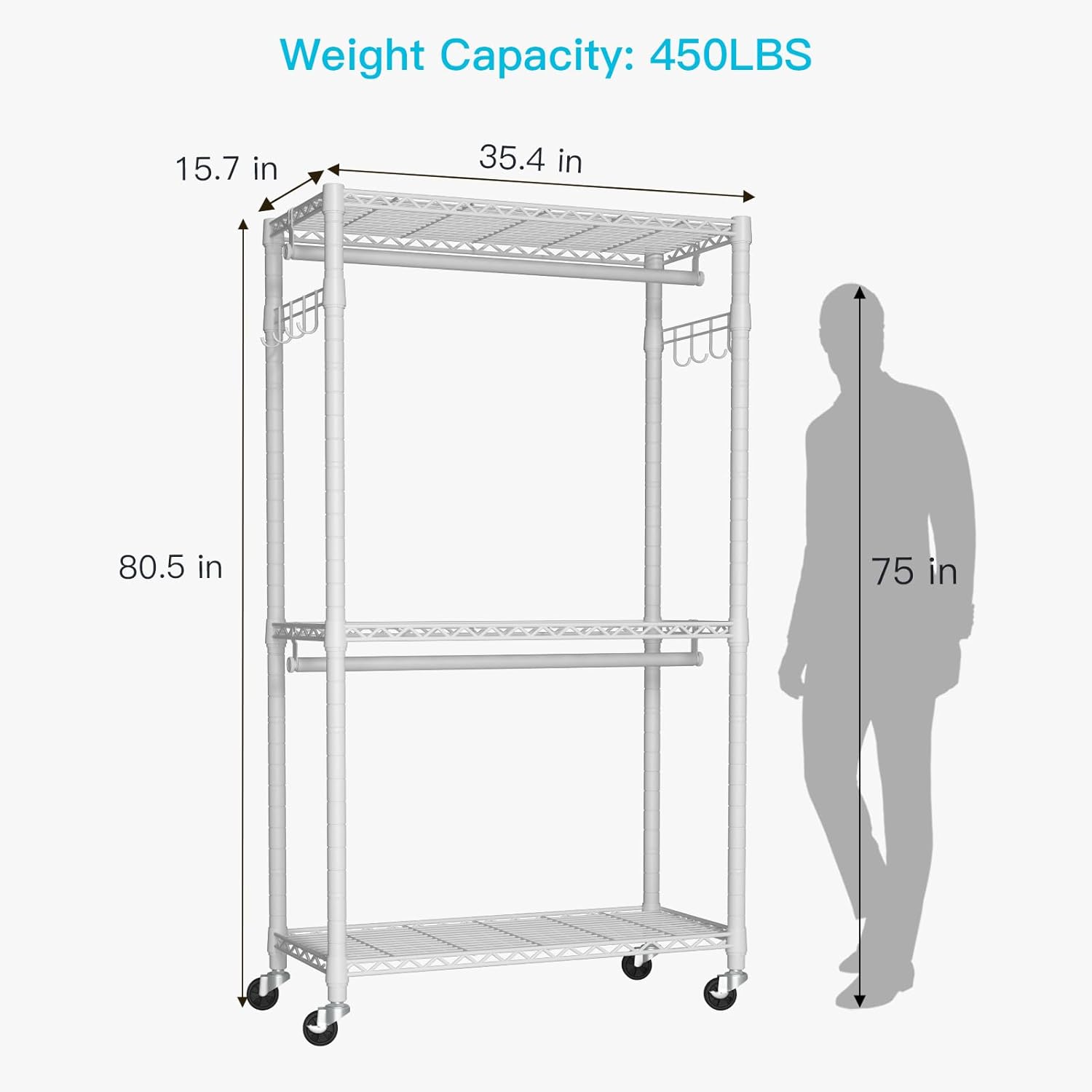 • DIMENSION & WEIGHT CAPACITY: 80.5"H x 35.4"W x 15.7"D (Included wheels height). Weight Capacity: 450LBS. The suitable height can make the clothing rack move freely when needed
