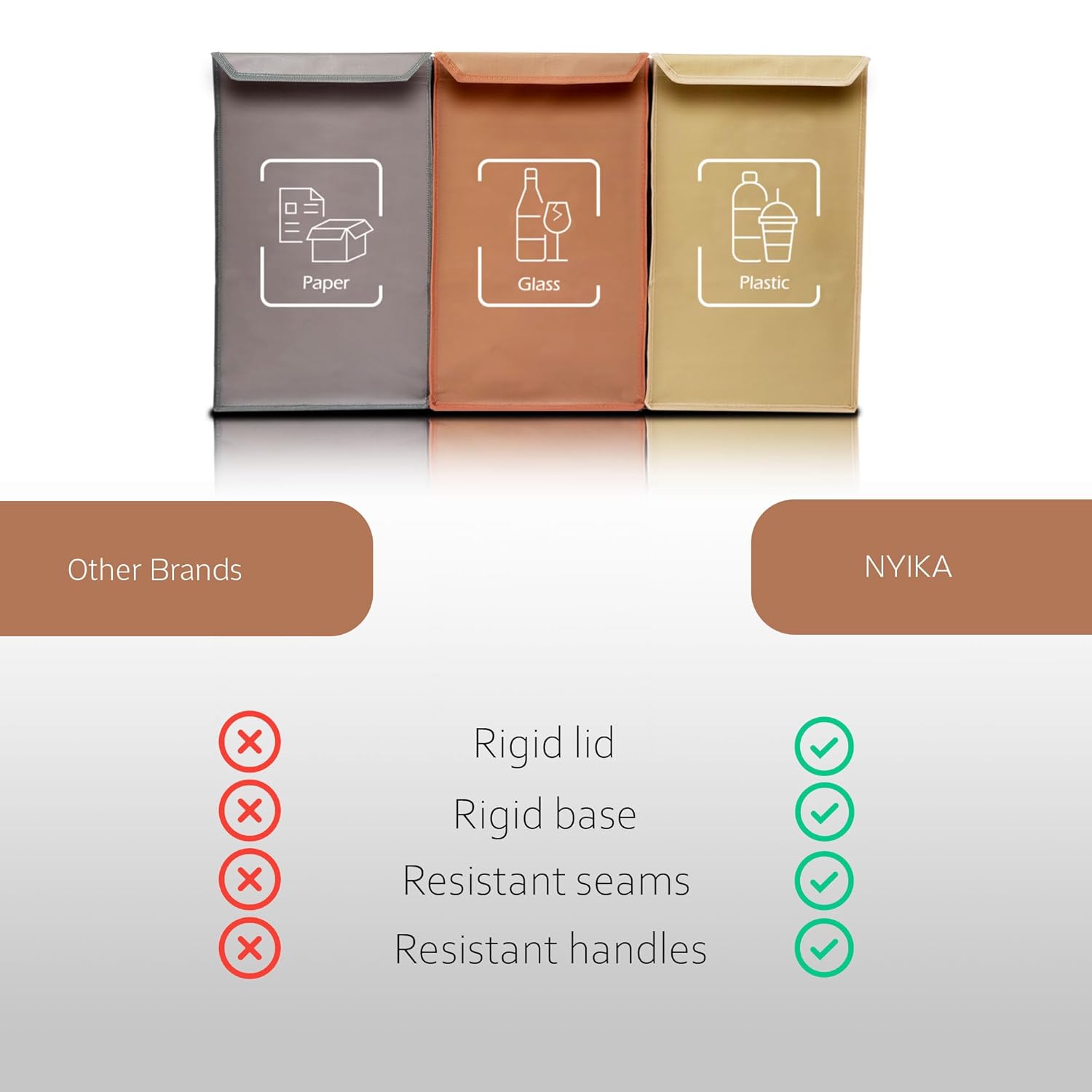 • Our recycling bags have excellent FEATURES such as their strong, semi-rigid material, which makes them collapsible, waterproof and easy to clean. They also contain a RIGID LID that makes recycling more convenient for any recycling bin kitchen.