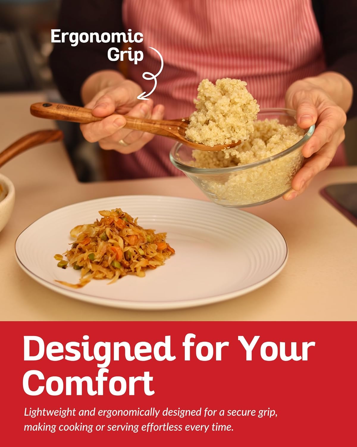 • DEAL GIFT FOR COOKING ENTHUSIASTS: These wooden spoon set are beautifully crafted from teak wood which gives these Wooden Utensils an aesthetically pleasing ambiance to any kitchen. Perfect for loved ones who like to cook, chefs or even for your own personal use.