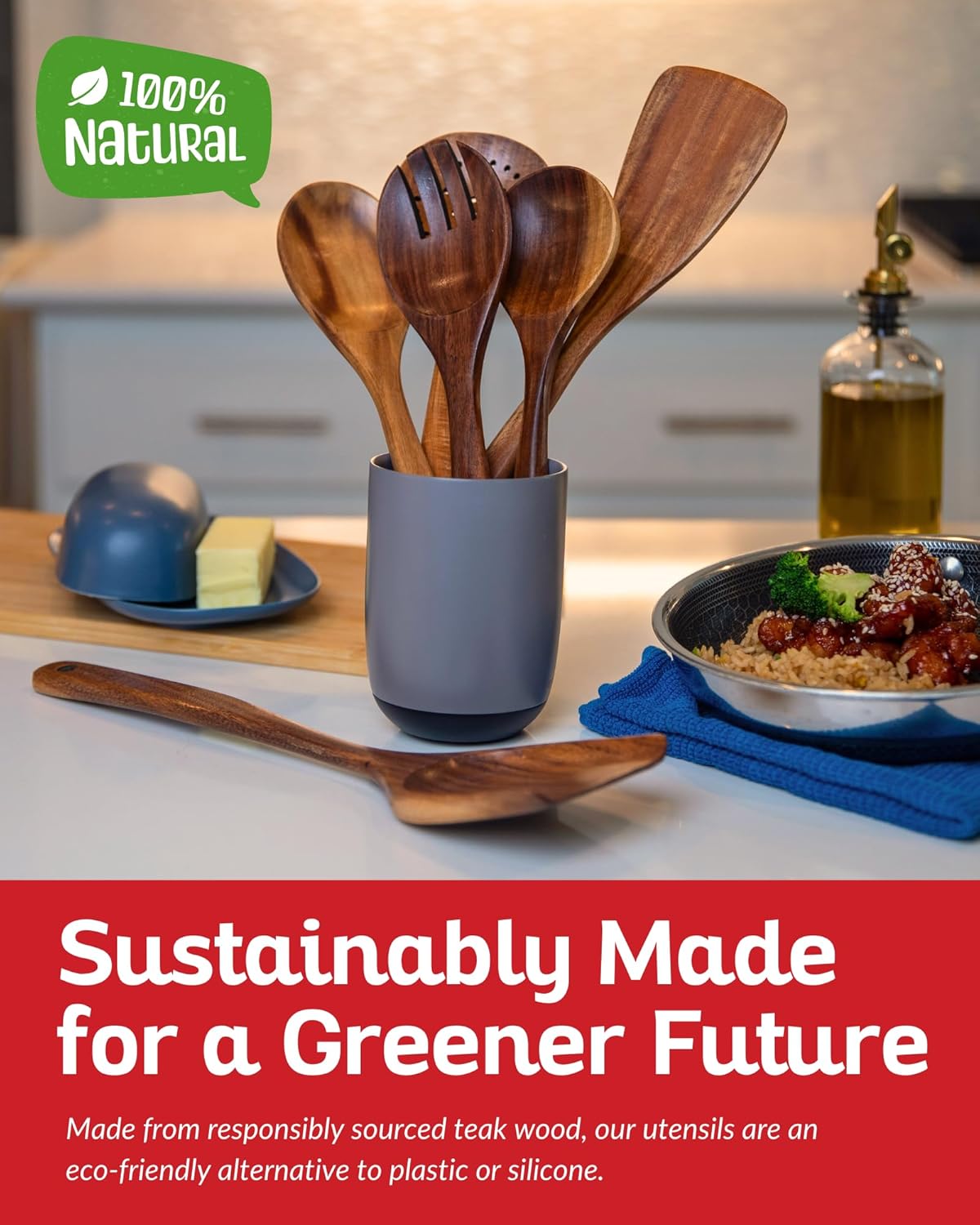 Boxiki Kitchen Luxury Teak Wood Utensil Set - Elegant 6-Piece Cooking Ensemble Including Spoons, Server, Scraper & Spatula - Expertly Crafted for Culinary Excellence
