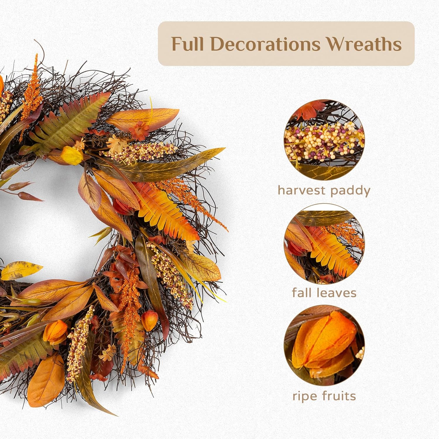 • Proper Size for Door: Our 24 inch large wreath is designed to perfectly complement your entryway. With an adjustable inner ring of 11.8 inches, you can manually refine the wreath's appearance to achieve the ideal shape. Please note, slight variations in size due to manual measurement are possible (±0.4-0.7 inches), adding a harvest touch to your décor.