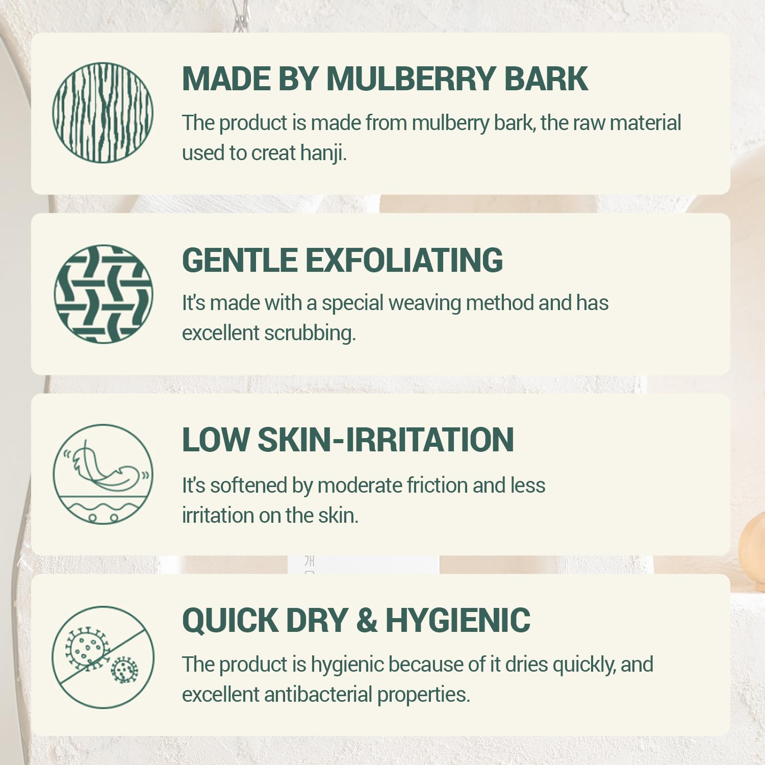 • HYGIENIC AND QUICK-DRY: Your hygiene is our priority, and our Korean Hanji Exfoliating Washcloth Towel adheres perfectly. It’s designed to ensure quick drying, keeping the towel fresh for your next use. It’s the ultra-hygienic use you've been seeking!
