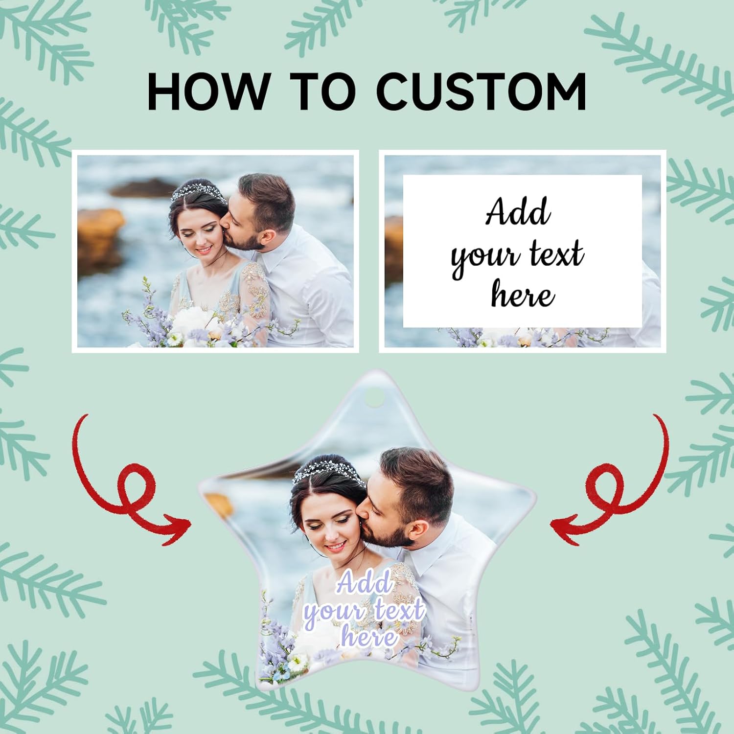 • 【Custom Photo Text Christmas Ornaments】Click on the " Customize Now " button to design your own Christmas ornament special with desired Photo, Picture, Logo, Text. Simply upload any photo, fit by the corners. Choose your font color, fill in the optional blank with your text. Our designers will do the rest.