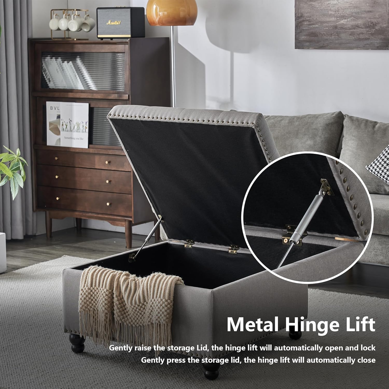 • 【Built-in Storage Compartment】 Our oversized coffe table ottoman features an extra room to store your things,the ottoman's top opens up to reveal a spacious compartment perfect for storing home essentials like throw pillows and blankets.
