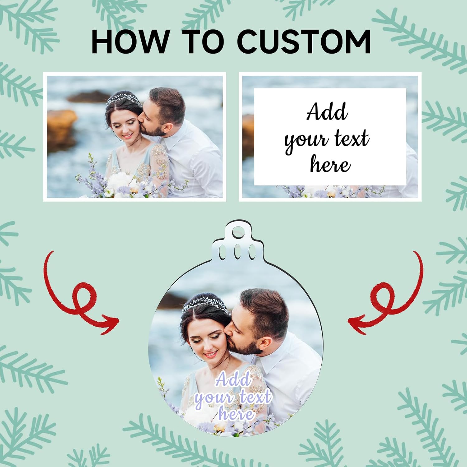 • 【Custom Photo Text Christmas Ornaments】Click on the " Customize Now " button to design your own Christmas ornament special with desired Photo, Picture, Logo, Text. Simply upload any photo, fit by the corners. Choose your font color, fill in the optional blank with your text. Our designers will do the rest.