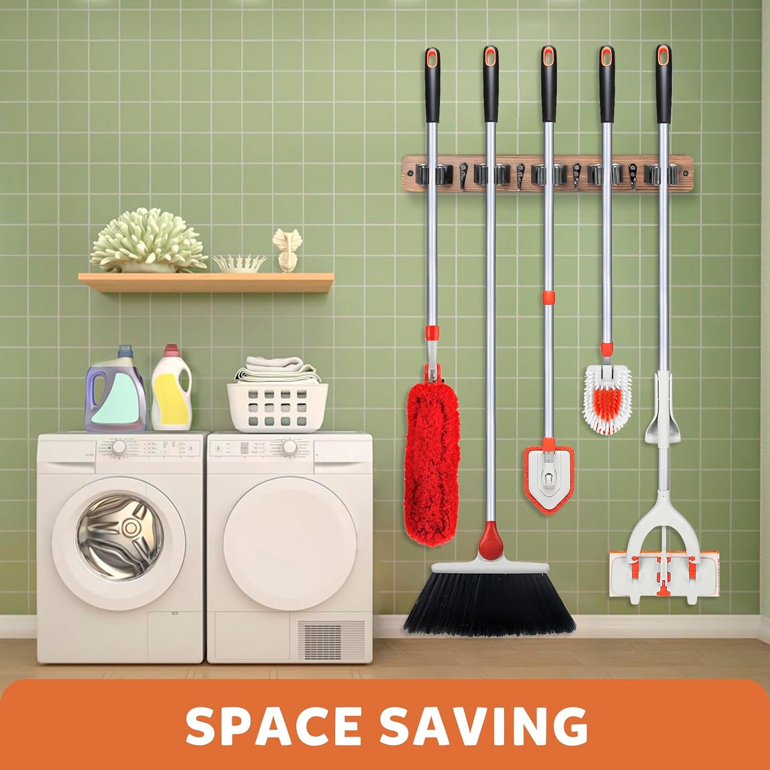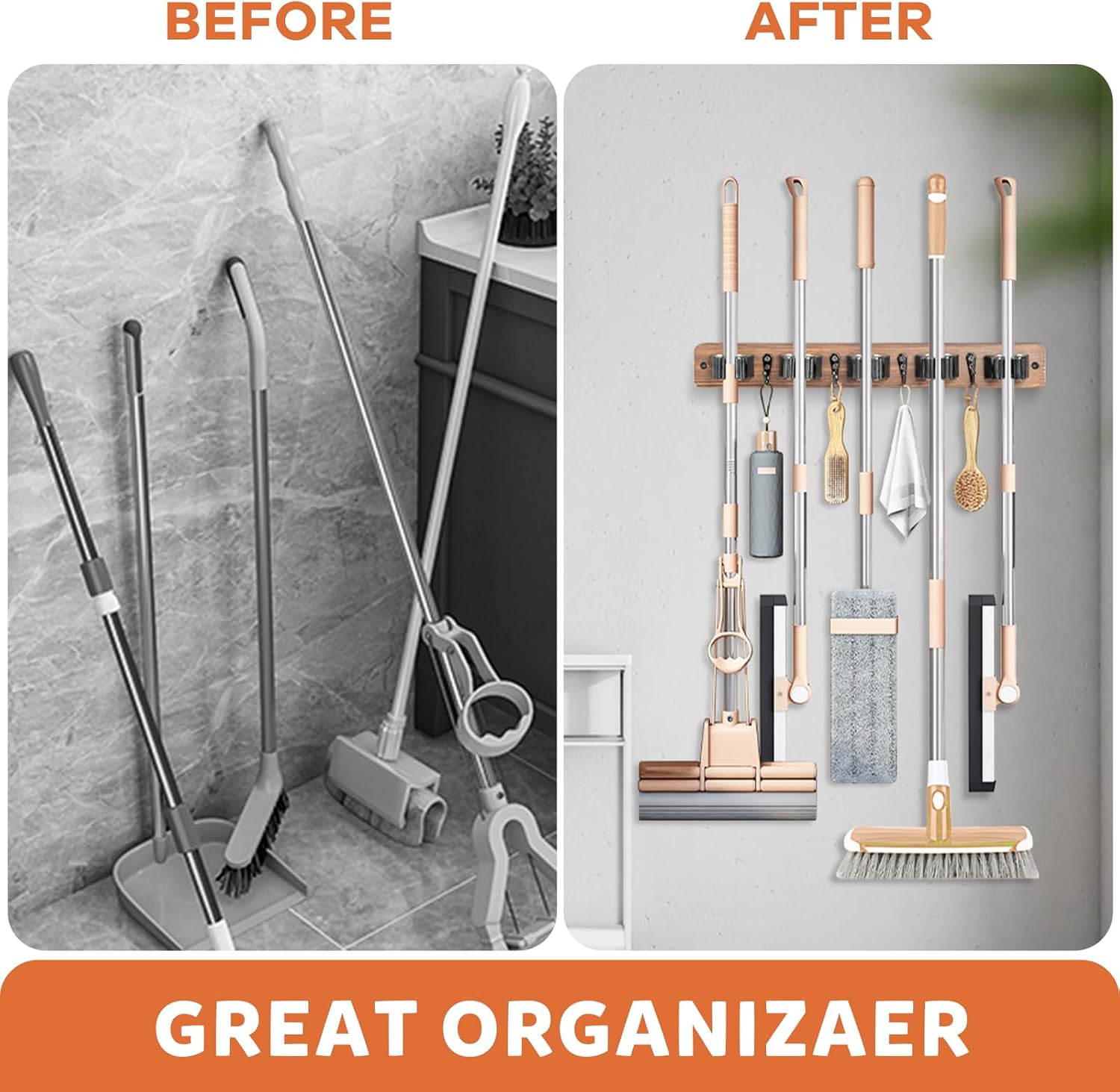 • 2024 NEW UPGRADE: The size of broom holder is 17inch*2inch. The installation hole distance is based on standard 16" spacing for stud placement, made mounting easy. 5 racks and 4 hooks effortlessly accommodates all your cleaning essentials with a great grip! The wall-mounted design ensures that everything is within reach