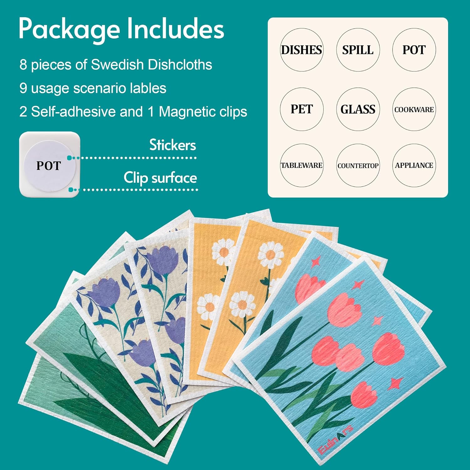 • Easy to Clean and Store: Our swedish dishcloths for kitchen, measuring 7.8 x 6.8 inches, each set comes with 8 cellulose sponge cloths in 4 styles, along with 2 self-adhesive clips, 1 magnetic clip, and 9 labeling tags. Customize storage for easy access, hanging them on walls, counters, or refrigerators to keep your kitchen organized