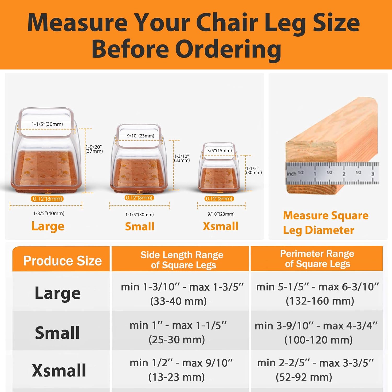 • APPLICABLE SHAPES AND SIZES: Our chair leg floor protectors only fit wooden square chair legs. Compared with the round chair leg caps, square chair leg floor protector fits the square chair leg better. We have tow sizes chair leg protectors for hardwood floors.Please measure the size of your furniture feet before buying.The L size chair leg floor protectors square is suitable for square leg with side length 1-3/10"" to 1-3/5""(33-40mm), irregular leg with perimeter 5-1/5"" to 6-3/10""(132-160mm)