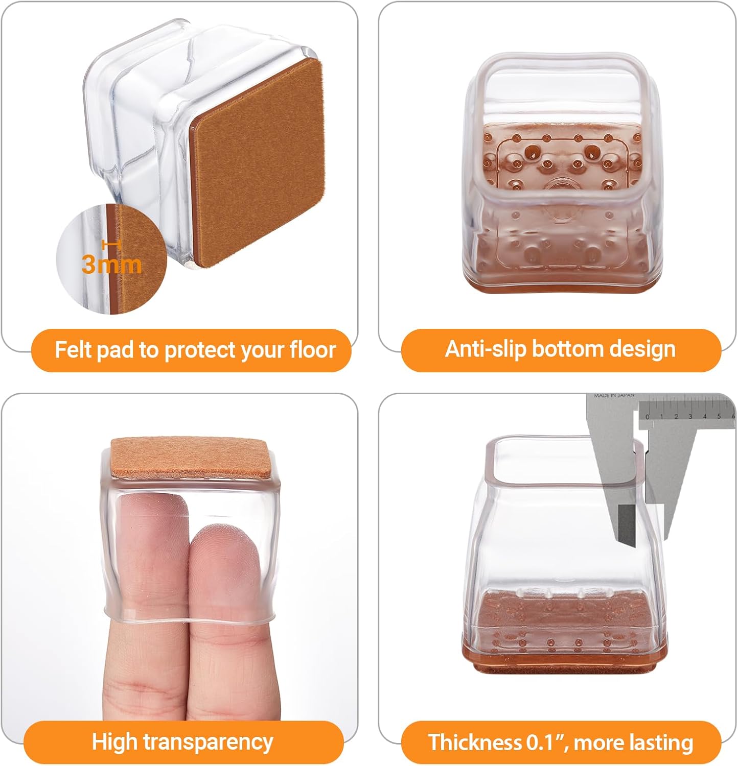 • ECO FRIENDLY AND LASTING: Our floor protectors for chairs made of eco-friendly silicone, nontoxic, safe for children & pets. Compared with the 1mm thick on the market, the inner wall of our upgraded furniture sliders for hardwood floors was thickened to 0.1""( 2mm ),the bottom was thickened to 1/5"" (5mm), which greatly enhanced the abrasion resistance and elasticity.Our felt pads for furniture doesn't slips off, thick and won't tear. Effectively protect your hard surfaces and tile floors!