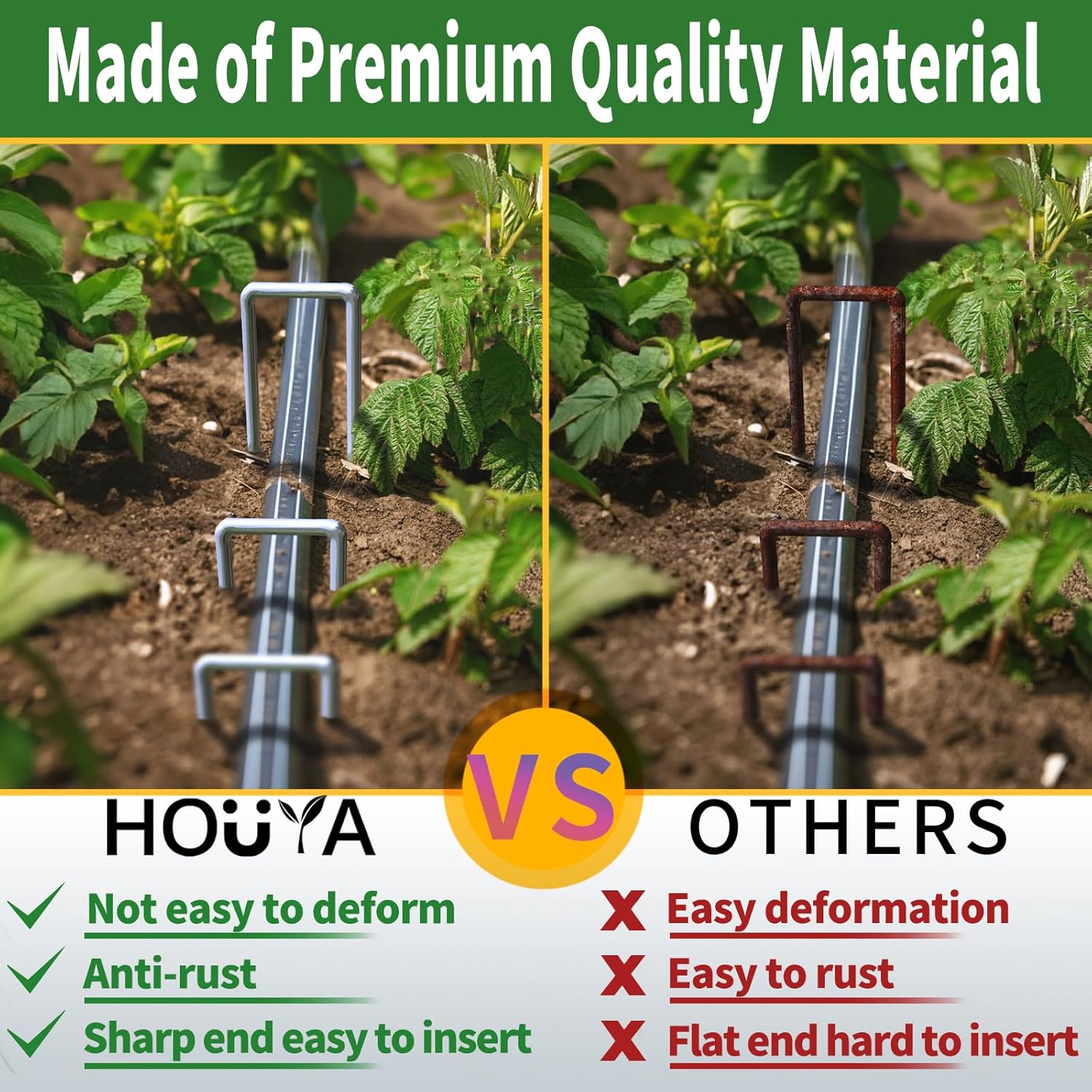 • 【Beveled Ends】The beveled end of the garden staples can easily penetrates turf, landscape fabric, heavy soil and weed barrier.