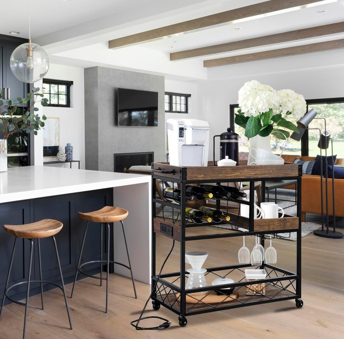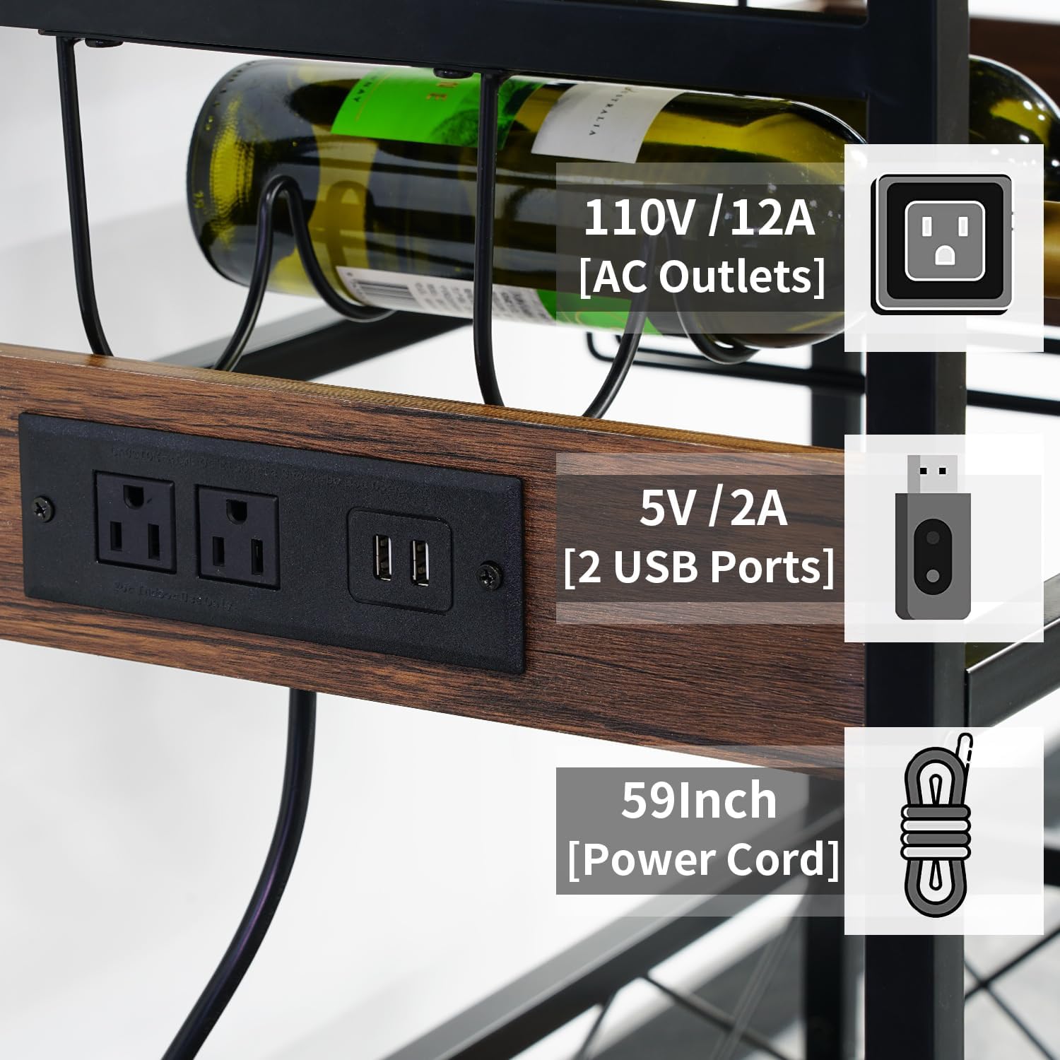 • Power Outlets: The industrial bar cart features power outlet of 110V/12A outlet and 5V/2A USB interface offering safe charging; the serving cart has a 59 inches electric cord, no need to move your coffee makers, toaster or microwave to get charged;