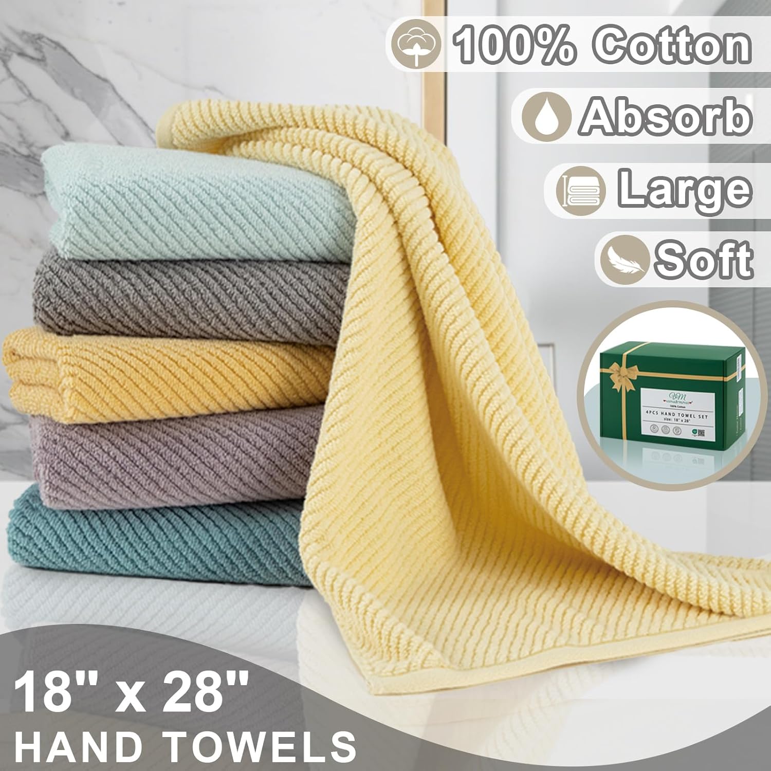 • 【Soft & Lightweight】 This set includes four lightweight hand towels, each 18 x 28 inches, made from 100% zero-twist cotton. These towels offer a luxurious feel that is both thick, soft, and large, all while maintaining a lightweight design. Ideal for daily use at home, the gym, spa, or hotel, they deliver comfort without excess weight. Fade-resistant, low-linting, breathable, and long-lasting
