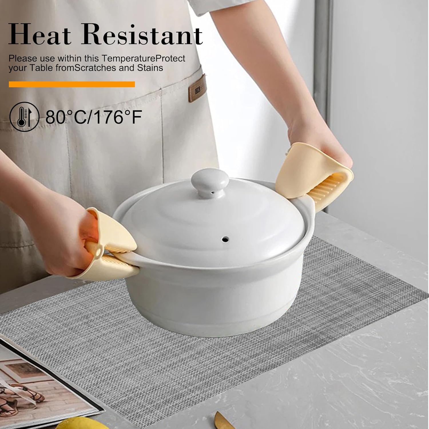 • Protect Your Table:Our placemats protect your table from scratches and spills while adding style. Heat-resistant up to 176°F (80°C), they also keep your food warm. With high-quality woven vinyl construction, they resist stains and water for daily use. Elevate your dining experience with these elegant and durable mats.