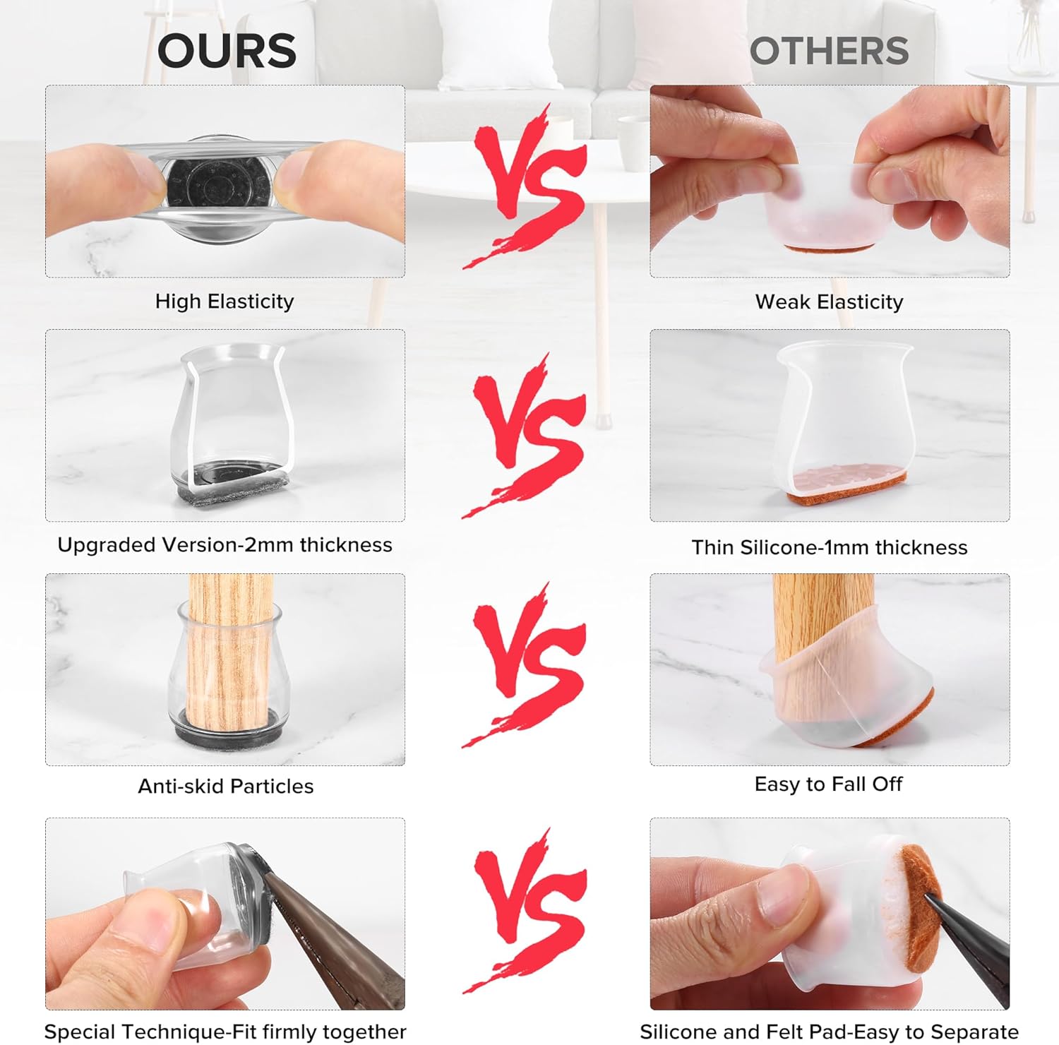 • ✅【Latest Upgrade】Compared with most of the traditional 1mm furniture pads on the market, our silicone chair leg protectors are made of 2mm thick silicone, which will never be damaged, durable. The ruby for chair legs will not change color when stretched. Inside of the inner sleeves are particles with anti-slip, which will firmly fix the chair and never make the covers fall off. Felt pads at the bottom make your furniture move silently and smoothly along floors without leaving marks and noise.