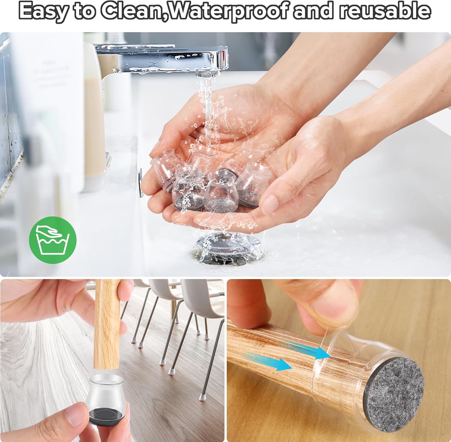 • ✅【Easy to Use】The chair leg covers to protect floors has high transparency, which greatly restore the original color of the table and chair legs, look more natural. The furniture leg cap is easy to install, without the use of tools. When the furniture chair socks are dirty, the chair stoppers can be cleaned and used repeatedly. Mainly suitable for smooth floors such as hardwood, tile, composite floor, and vinyl floor. Clear cap style match with most floors.