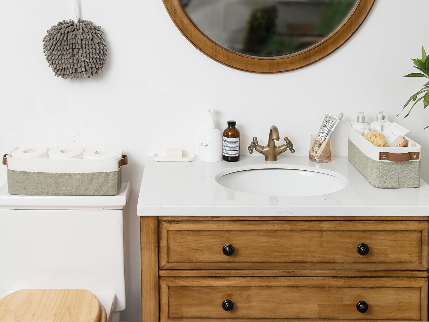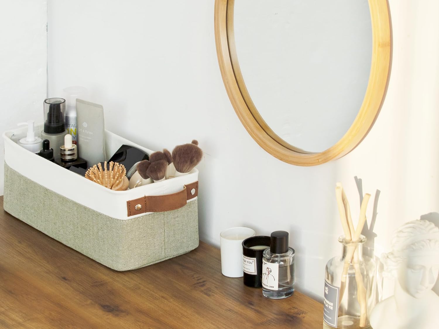 • The sleek modern design with 2 widened sewn-in handles makes this small basket a great addition to any home.