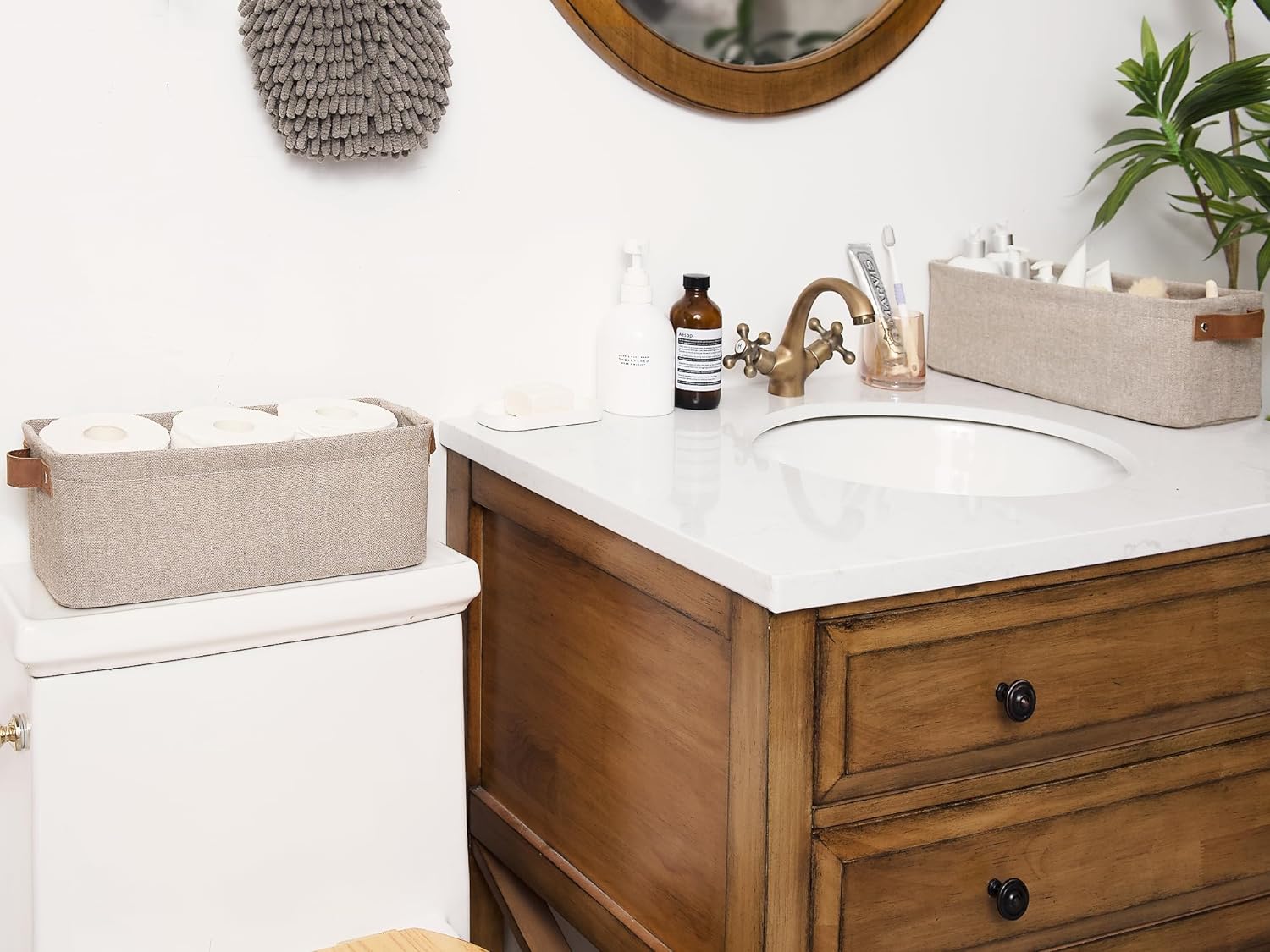 • The sleek modern design with 2 widened PU handles makes this small basket a great addition to any home.