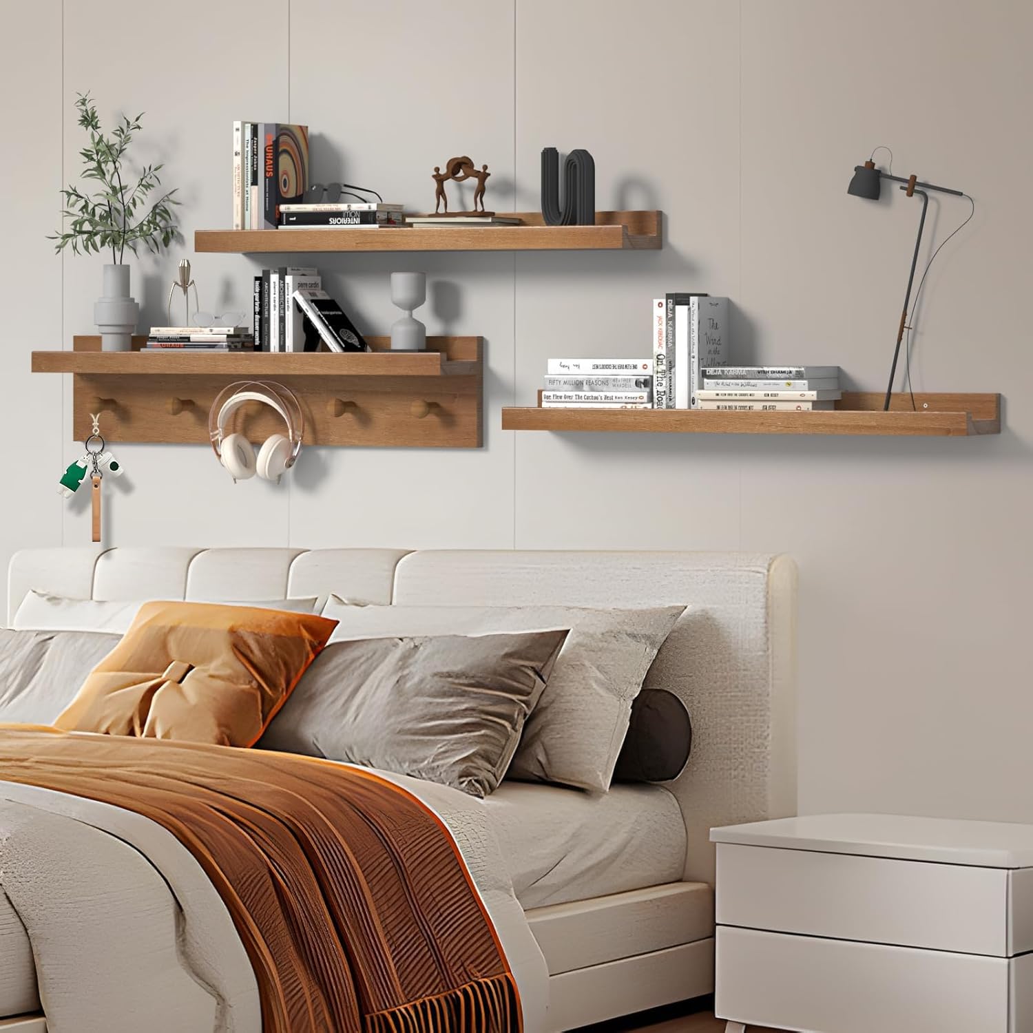 MBYD 24 Inch Floating Shelves, Picture Ledge Shelf, Natural Wood Wall Shelf, Nursery Book Shelves for Kids Room Decor with Hooks, Kitchen Bathroom Storage, Living Room Walnut