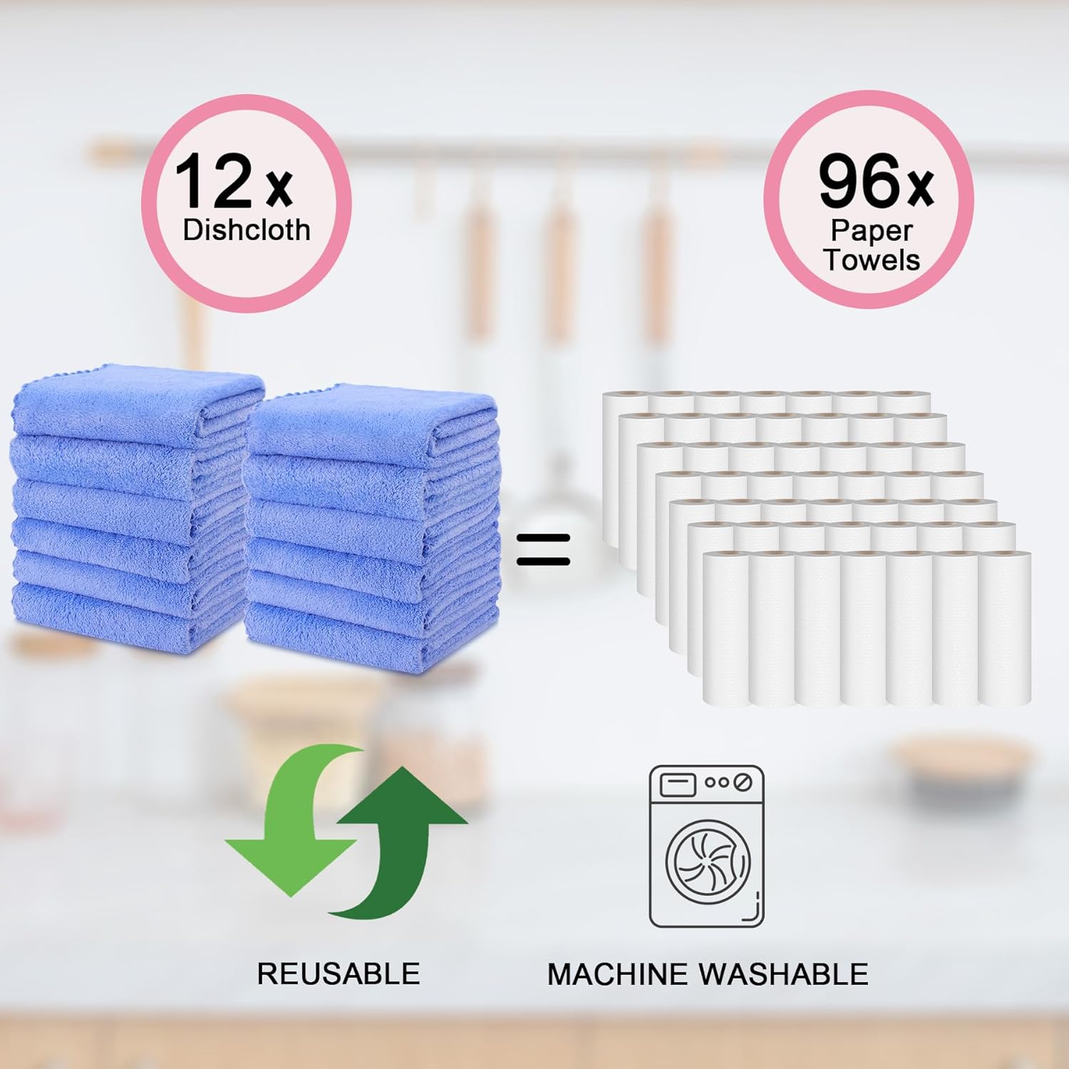 kimteny Kitchen Cloth Dish Towels, 13x28 Inches Premium Dishcloths, Super Absorbent Coral Velvet Microfiber Cleaning Cloths, Fast Drying Rags for Washing Dishes (13x28-12 Pack, Blue)