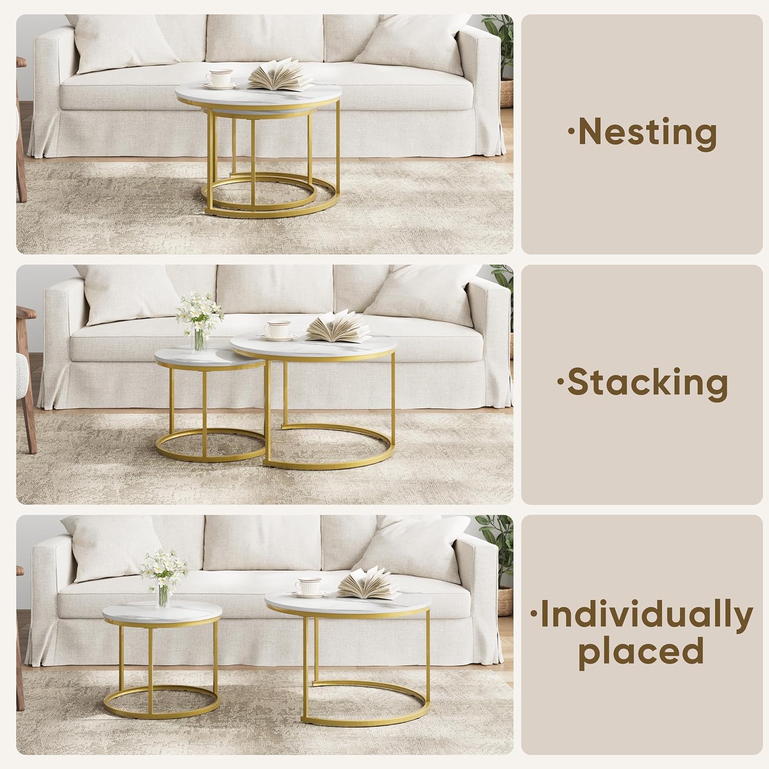 • 【Space-saving】The design of circular nested coffee tables is simple and beautiful, while also practical, allowing for the use of different sizes of tables as needed. Due to the nesting design, multiple coffee tables can be stacked together, saving space, especially in small spaces.