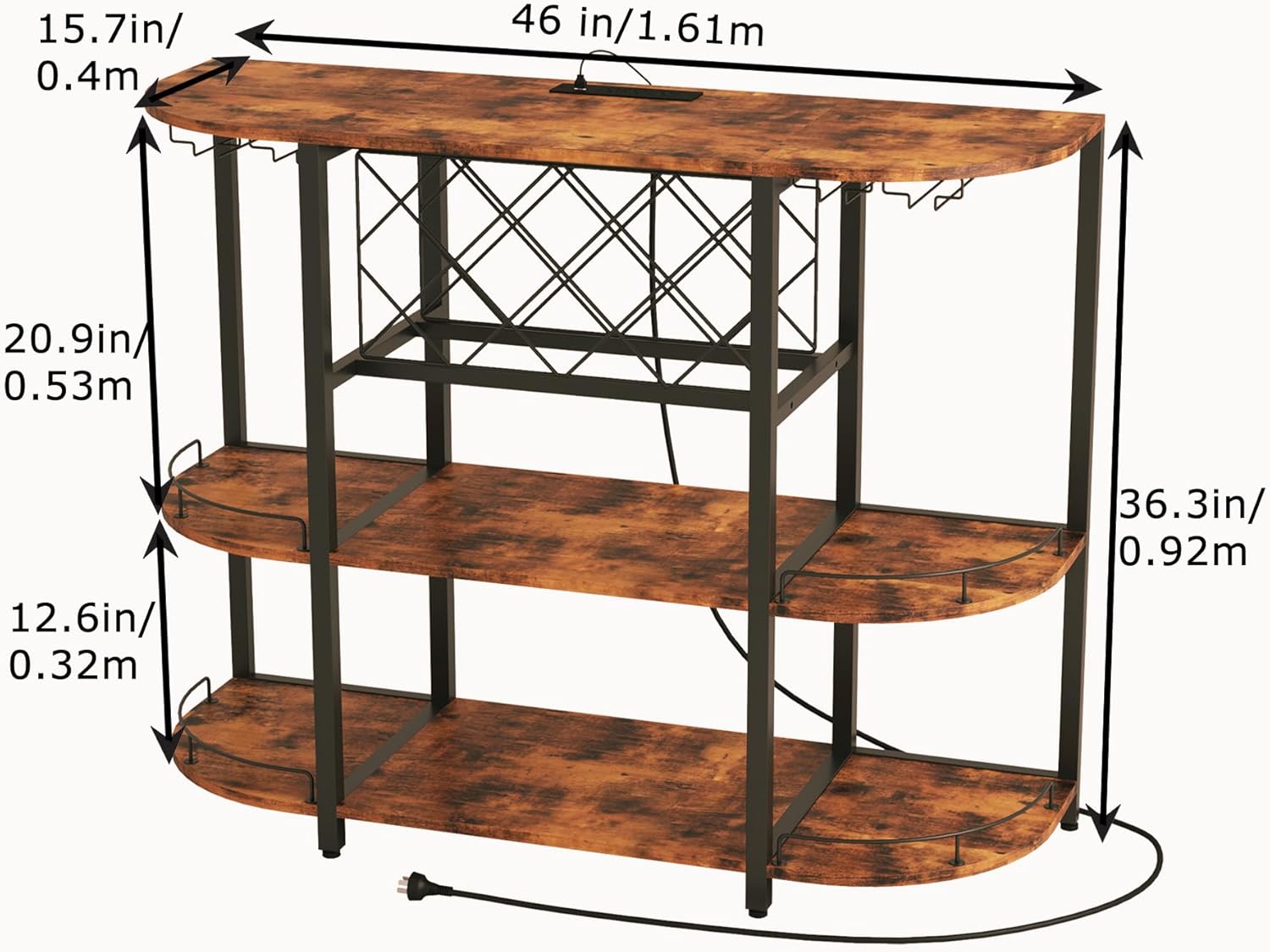 Wine Cabinet Bar Cart Table with Power Socket and LED Light, Three Tiers Coffee Bar Table Wine Rack Liqour Bar with Large Storage for Home Kitchen (Retro Brown)