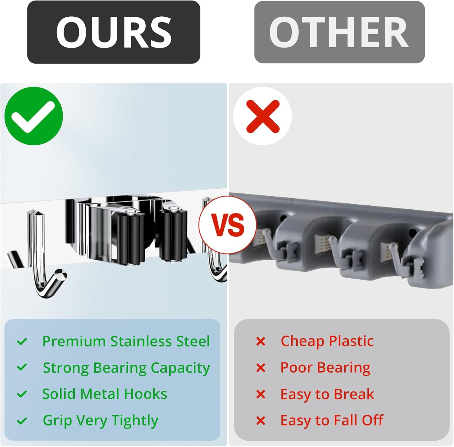 • 🏡【STURDY BROOM HOLDER】Each broom holder wall mount has 4 racks and 5 hooks. Our broom holder is made of sturdy 304 stainless steel which means it is corrosion-resistant, rustproof and waterproof. Compared with the plastic broom rack, our broom organizer is more stronger and has a longer service life.