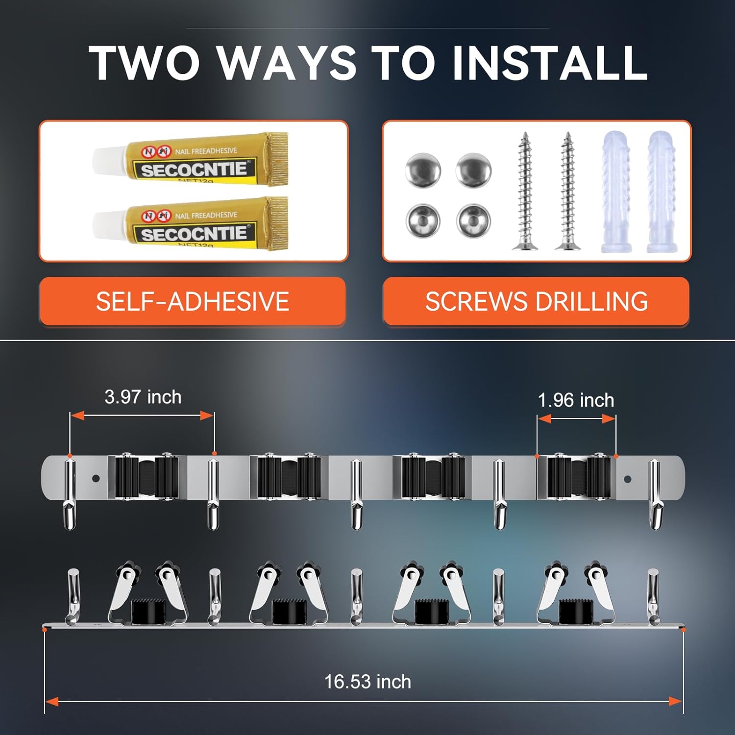 • 🏡【EASY TO INSTALL & USE】There are two ways to install the broom hanger, designed for different installation surfaces. For smooth surface, you can install the broom holder by self-adhesion, and for rough surfaces, screw drilling wall mounted is more recommended.