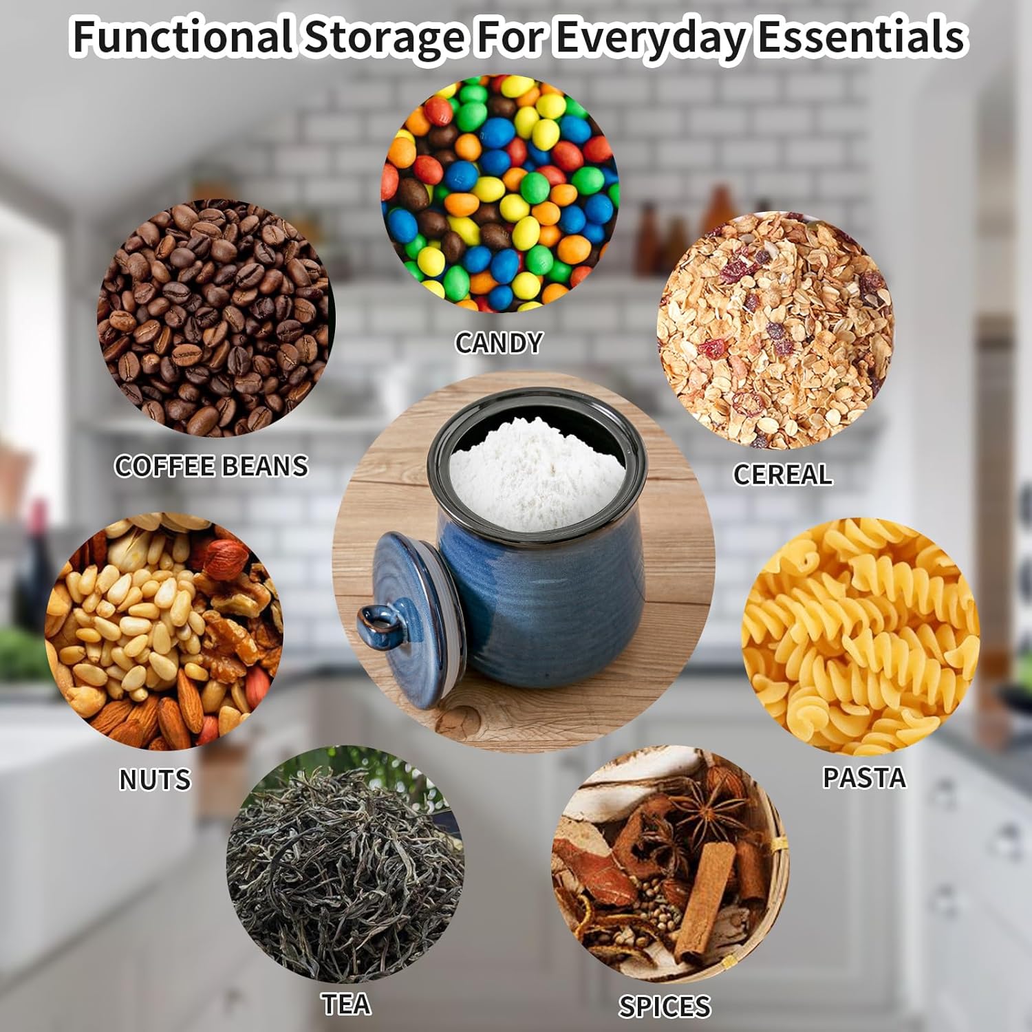 • LARGE KITCHEN CANISTER: Our ceramic jar measures 6.2*6.2*8.2 inch and the capacity is 88 oz/ 2500 ml. With generous food storage capacity, this kitchen canister can use to store flour, sugar, coffee bean, tea, biscuit, candy, spice, seasoning or dog treat.