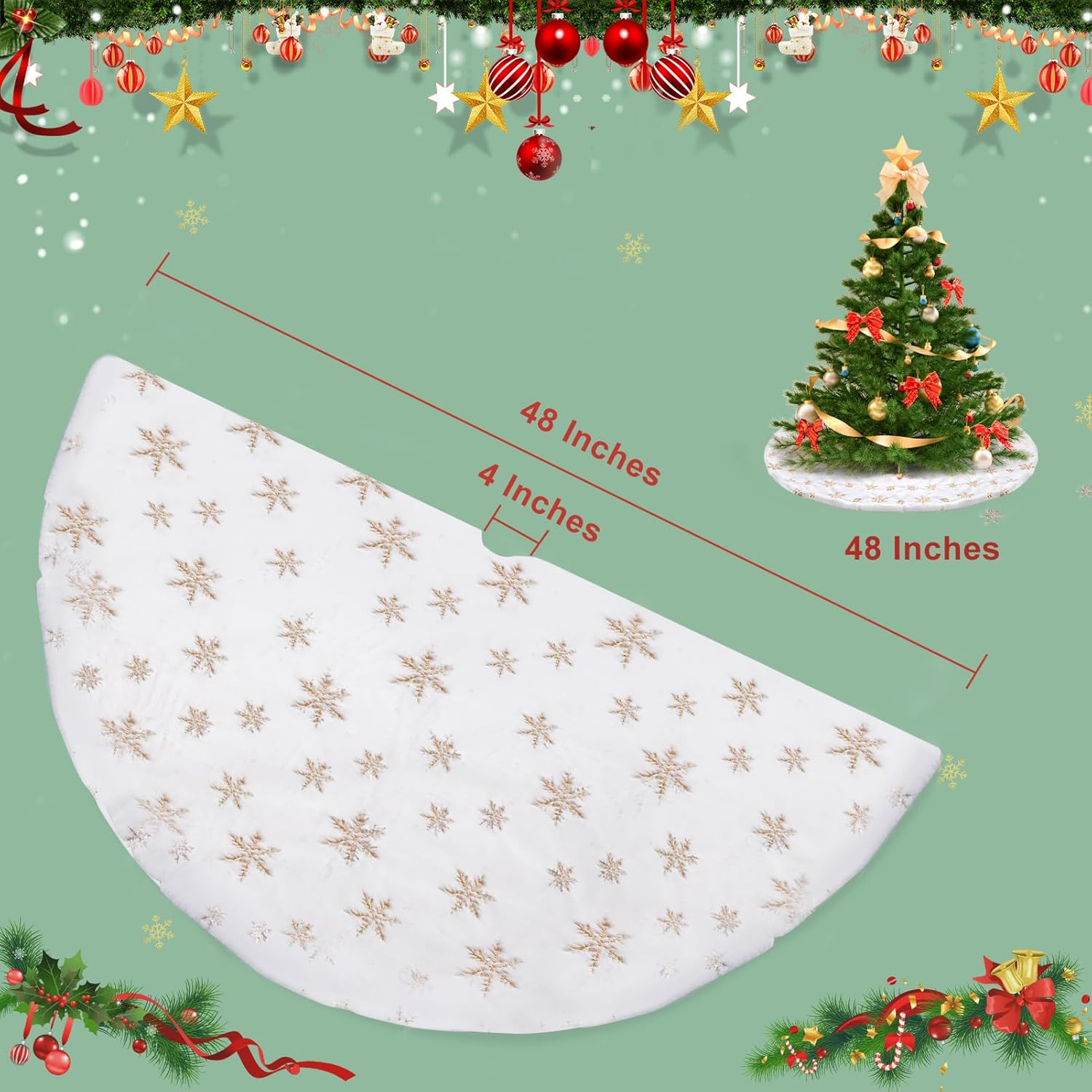 • Suitable Size: With a generous diameter of 122 cm/48 inches, our xmas tree skirt fits perfectly with trees ranging from 5 to 7 feet in height, whether they are traditional or artificial. It provides an ideal space to showcase your favorite gifts and becomes a beloved spot for pets and children during the winter and Christmas season.