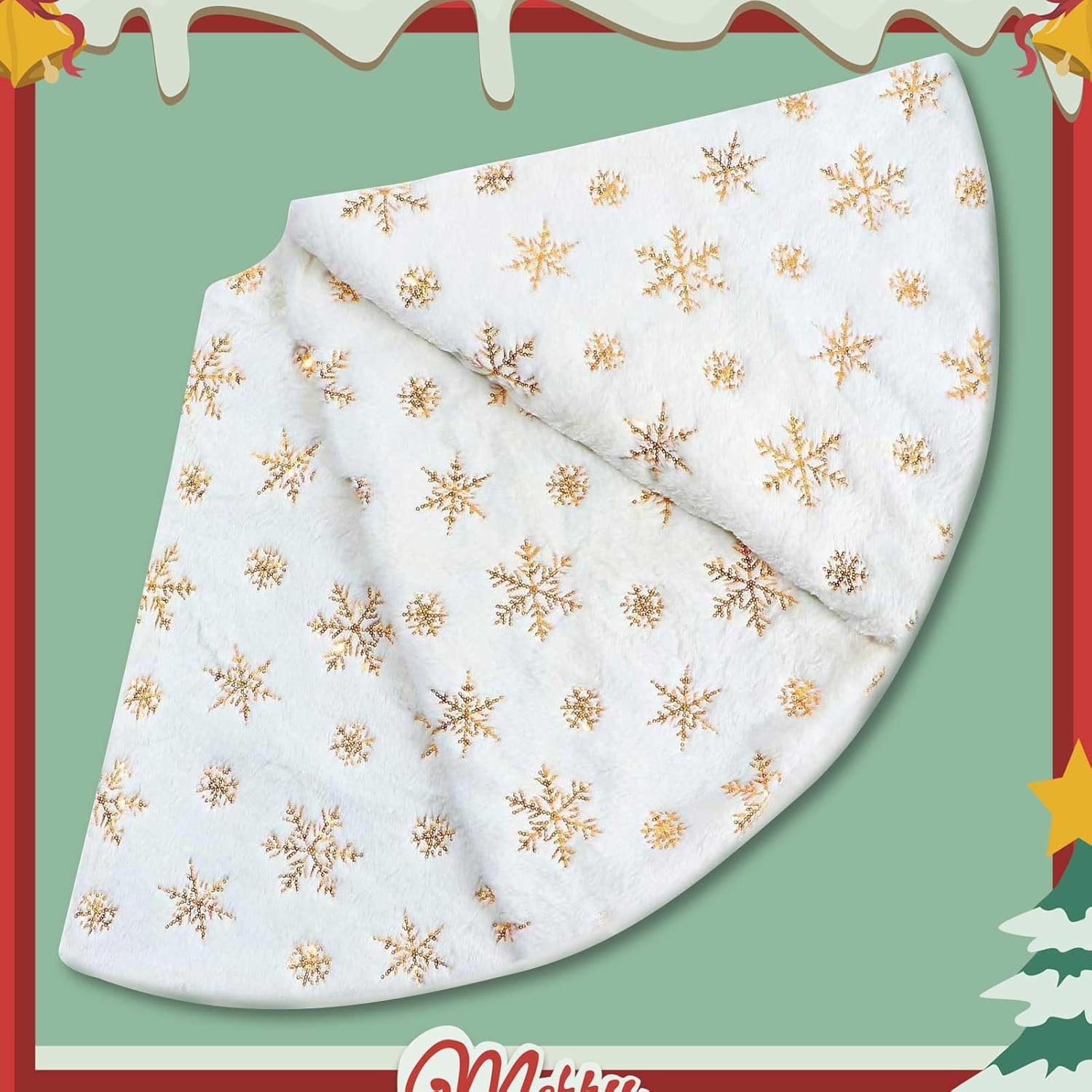 • Ideal Christmas decoration: Double layer design, back with non-woven fabric and front with Short faux fur. There are many gold sequined snowflakes on the white christmas tree skirt, like snow falling on the ground.