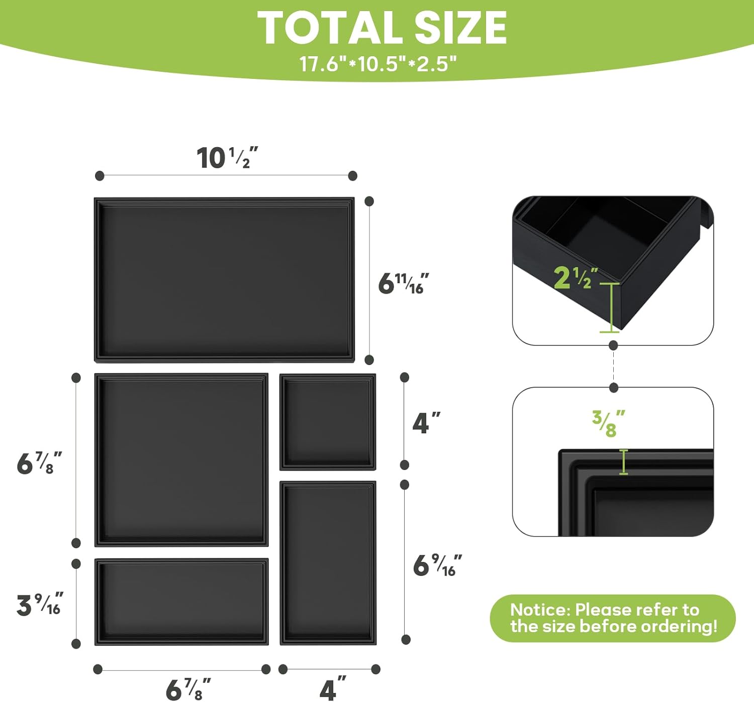 • 2.5" High Bathroom Drawer Organizer Trays: Greatseas bathroom drawer organizer trays provide ample space for storing items such as makeup, lotion, facial cleanser, perfume, and toiletries. The deep compartments ensure that your belongings remain secure, whether on a countertop or in a drawer