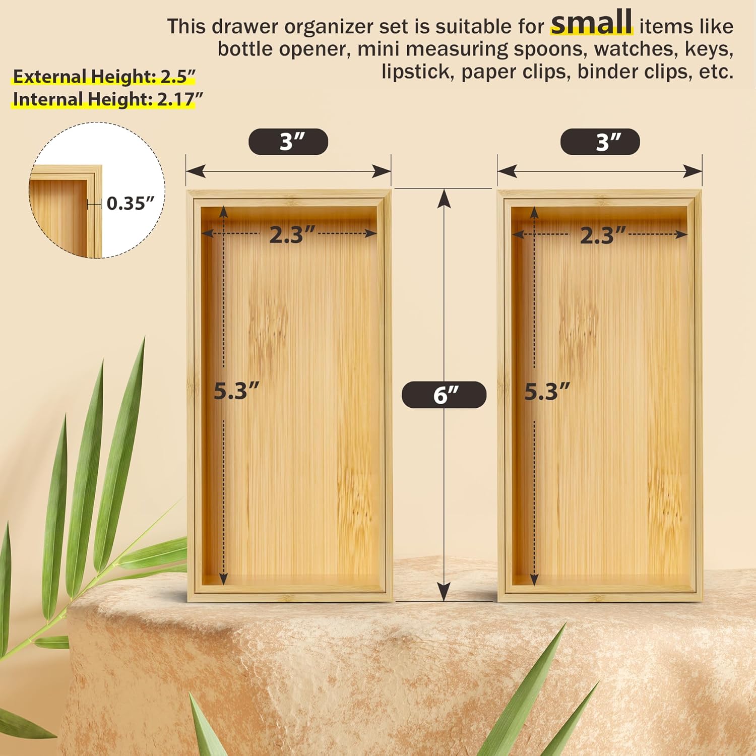 • Please double-check the size before purchasing: External Size: 6" L x 3" W x 2.5" H; Internal Size: 5.3" L x 2.3" W x 2.17" H. We highly recommend measuring your drawer or items to ensure a proper fit.