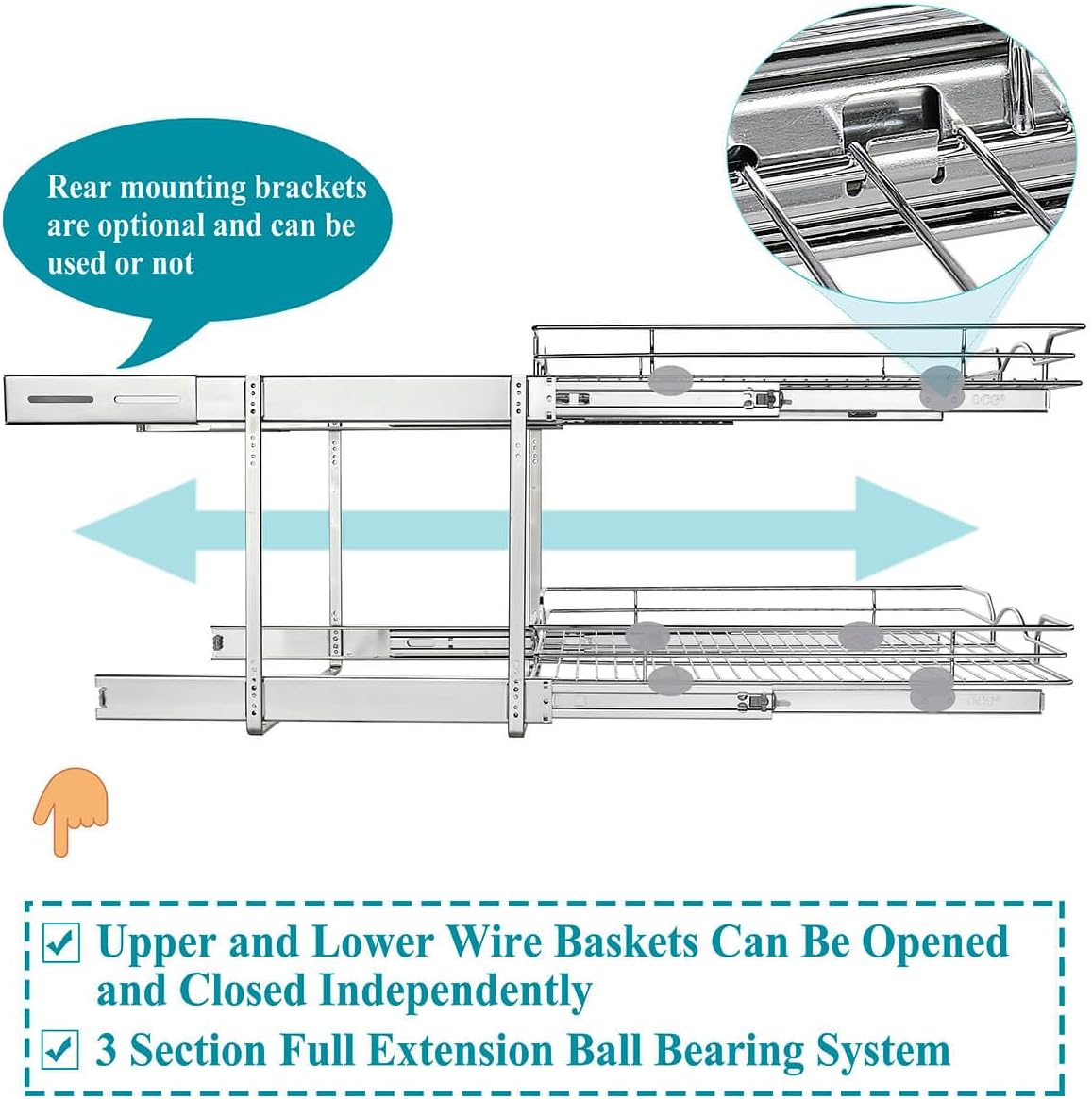 • Easy to Install: Comes with step by step installation manual,mounting template and all the hardware necessary for a quick, easy install. Both upper and lower wire baskets slide out independently on precision ball bearing slides so you can reach to your items easily and more quickly.