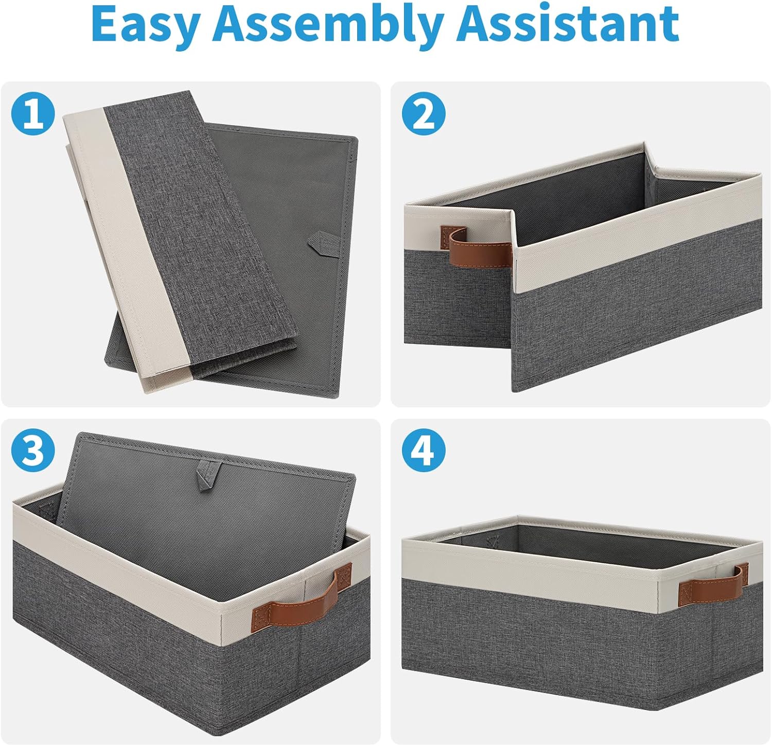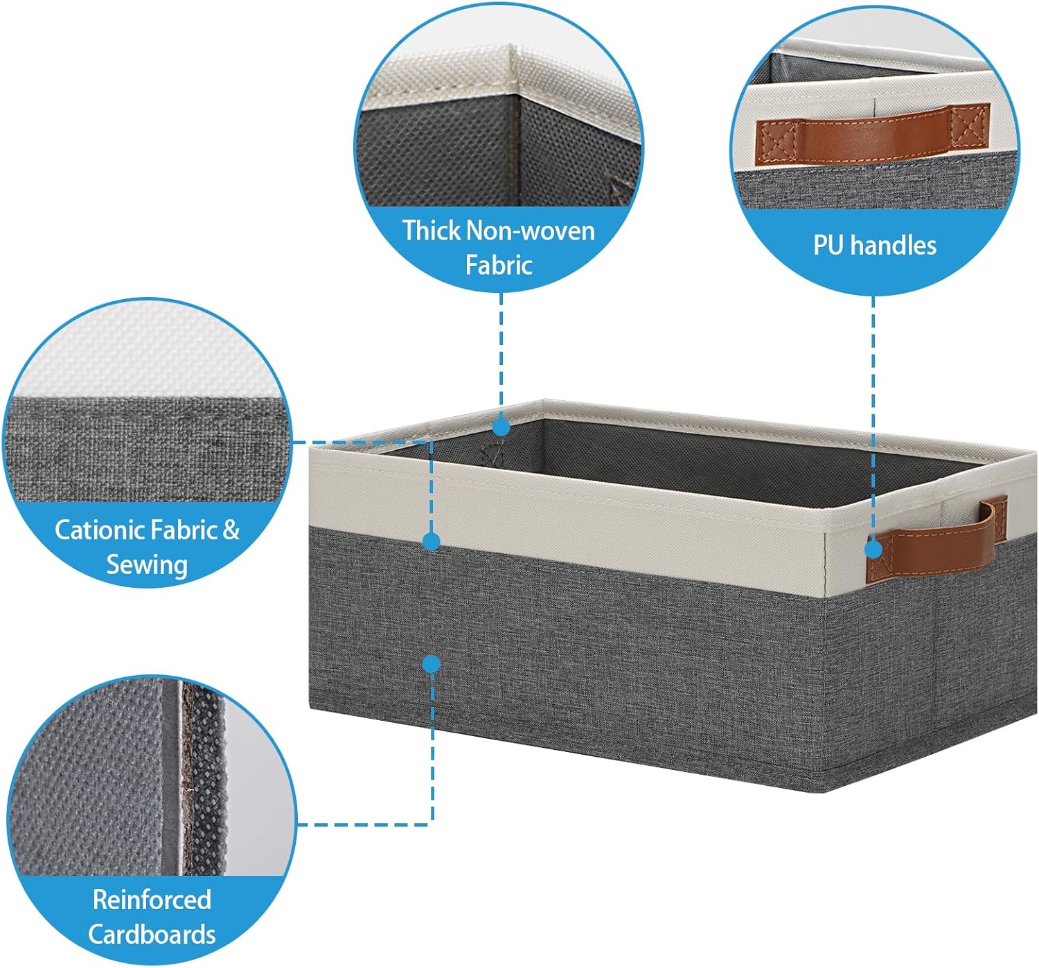 • 👍【QUALITY MATERIAL】Storage baskets for shelves are made of high-quality cationic fabric and polyester cotton fabric, and the inner layer is made of non-woven fabric, which is odorless, long-lasting and strong. Classic faux leather handles that adds a comfortable touch and provides a strong and comfort grip to pull and move. Fabric storage bin is easy to clean, just wipe with a damp sponge or cloth.