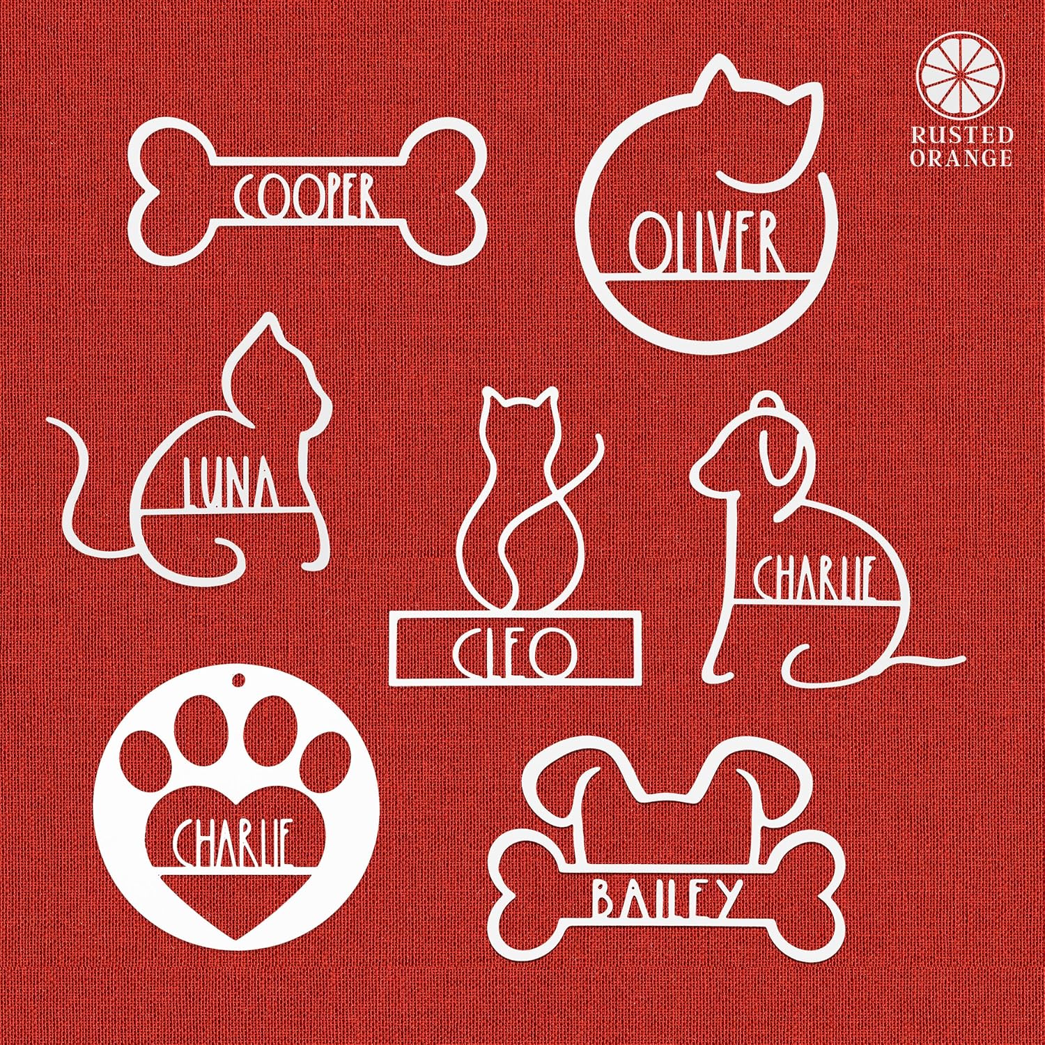 • 6" Dimensions: Bone - 3.75" tall x 7.75" long | Cat Curled Up -5" tall x 5.65" wide | Cat Side Profile - 5.5" tall x 5.6" wide | Cat Sitting 6.8" tall x 5.7" wide | Dog Side Profile - 5.6" tall x 5.9" wide | Dog with Bone 4.2" tall x 6" wide | Paw Print 5.8" tall x 5.8" wide