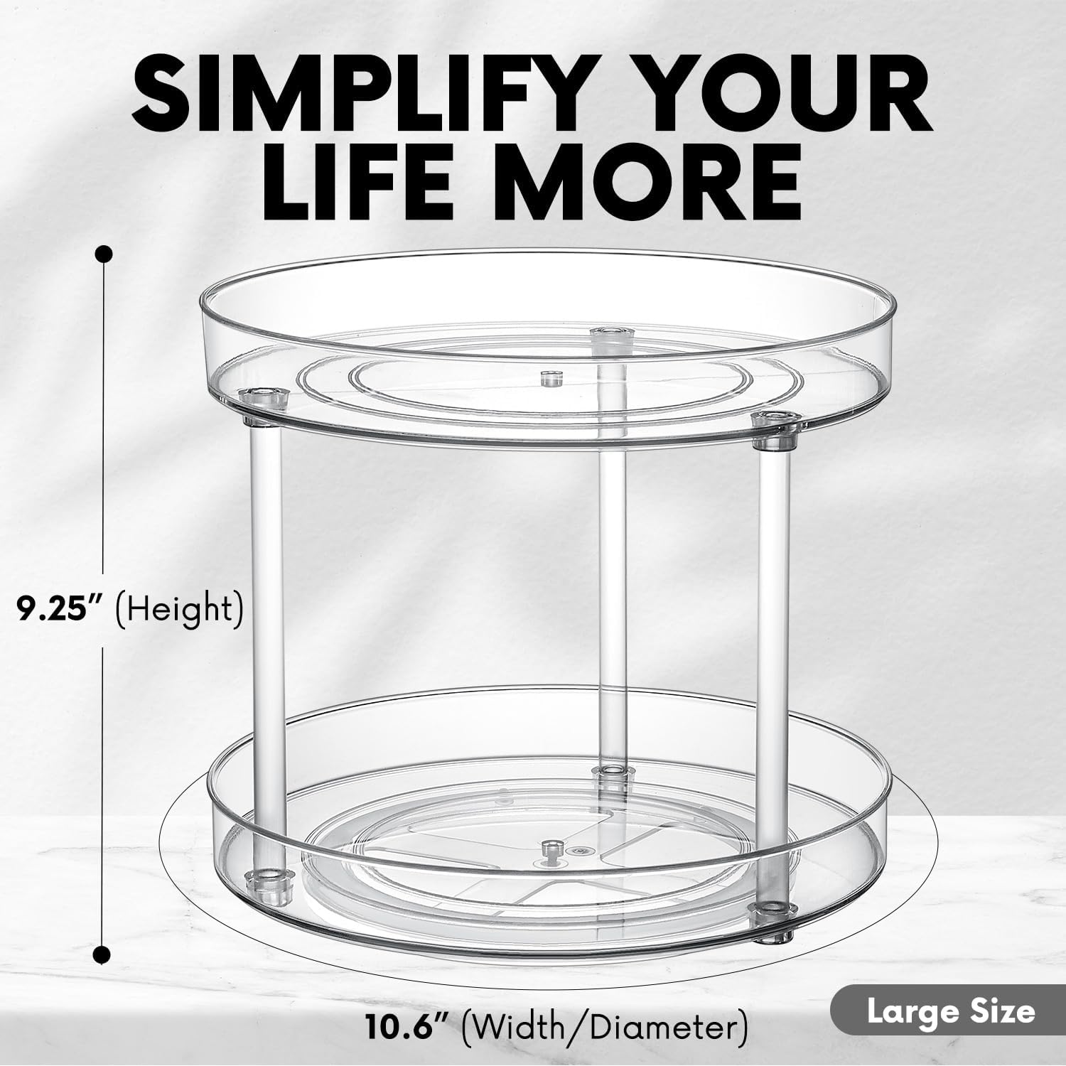 • COMPACT YET SPACIOUS - Our 2 tier lazy susan spice organizer boasts an impressive storage capacity for condiments, spices, makeup, skincare, perfume, cosmetics, and other small essentials, all while maintaining a compact footprint that won't overwhelm your space. At 10.6"D x 9.25"H, this turntable can fit seamlessly into your pantry, cabinet, dresser, and even in most refrigerators.