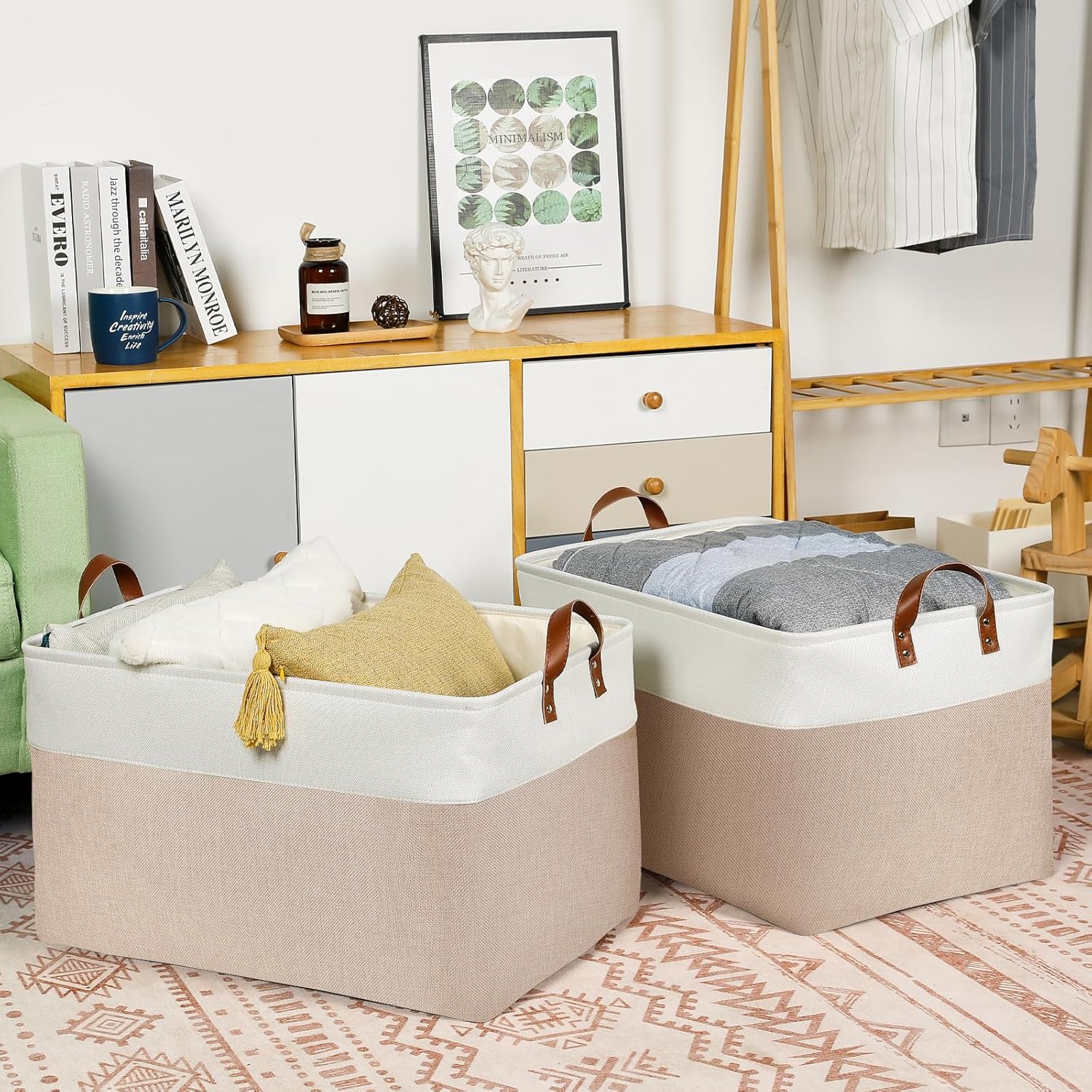• 【Unique Design & Modern & Decorative】Set of 2 large storage baskets, dimensions(each): 22(L) x 15(W) x 13(H) inches. Fabric baskets for organizing bring you organizing convenience and a sweet home. Great for socks, underwear, books, magazines, toys, baby clothes, pet products, wipes, towels, decorations, office supplies, DVDs, and gifts. The Large Fabric baskets with neutral colors can match a lot of home styles - keeping your home nice and tidy.