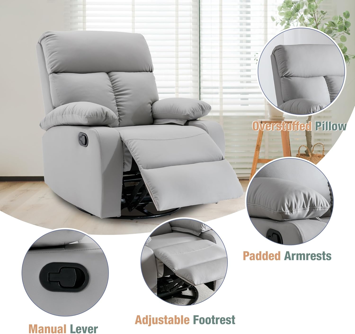 • Anti-scratch Leather Recliner Rocking Chair: This light grey rocker recliner chair is made of anti-scratch leather with the touch of leather, providing a unique visual effect. Small rocker recliners for small spaces has a simple and fashionable design, making the recliner rocking chair suitable for all occasions. And the small rocker recliners for small spaces unique waterproof, anti-scratch performance, easy to care and very well match with other leather swivel rocker recliner in your home
