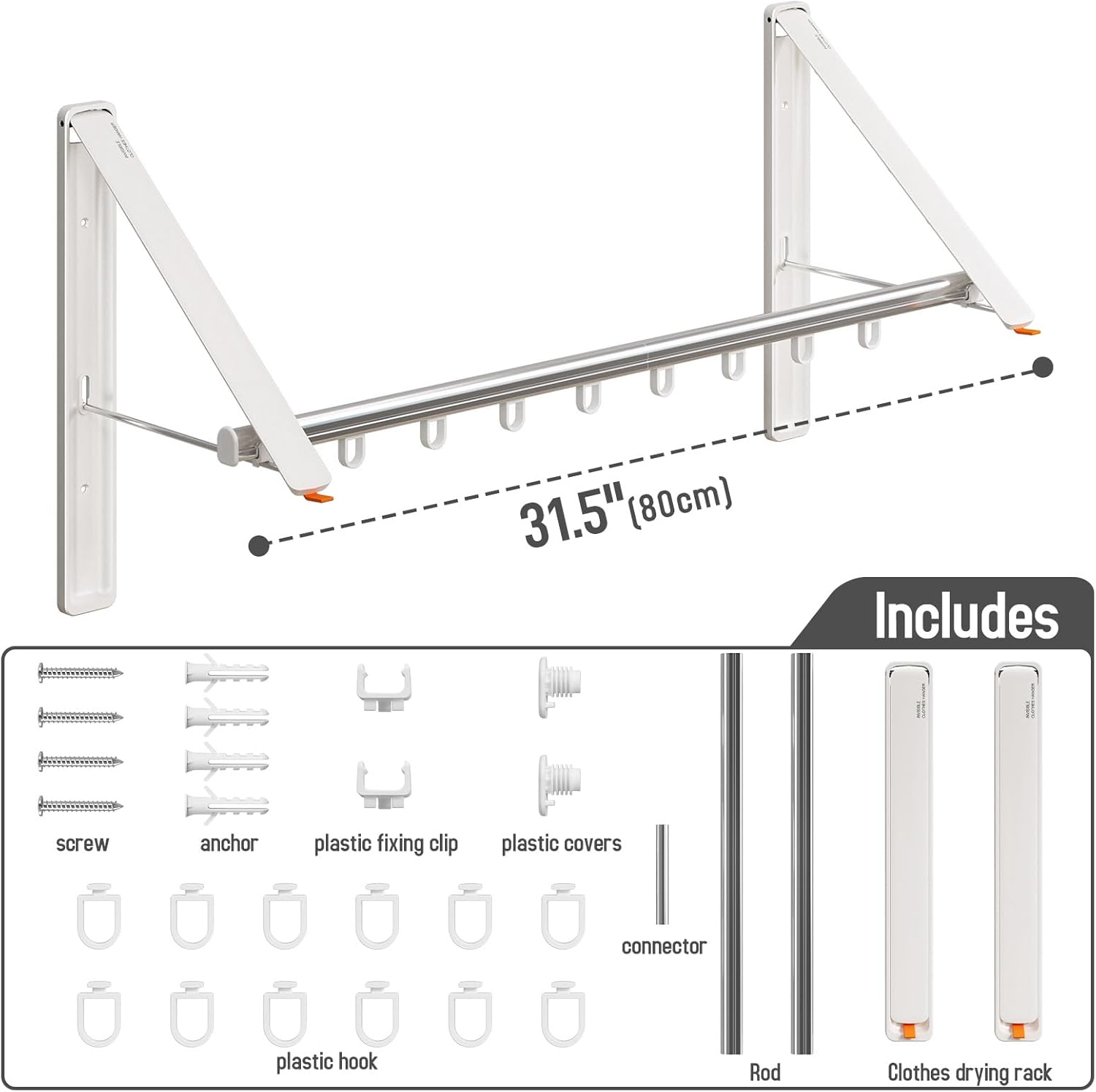 • Rich accessories: With just one order, you can purchase a complete set of drying tools. Our package includes 2 foldable clothes hangers, two 40cm long clothes poles, a clothes pole connector, 12 hooks, and necessary fixing screws