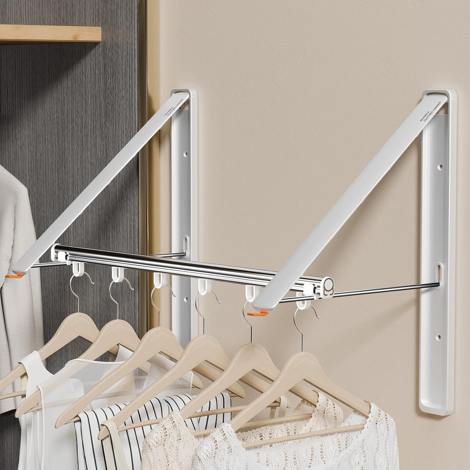 • Install in No Time: All you have to do is place the guide onto the wall, drill your holes, put in the anchors, and install the screws. Once the two foldable clothing racks are secured, add the extended rod. Then you can start airing the clothes