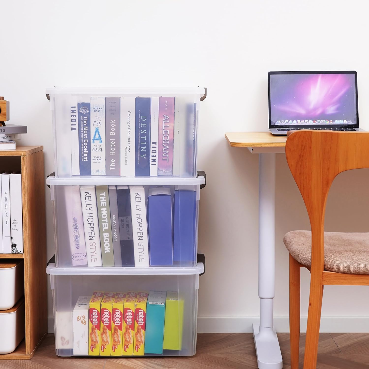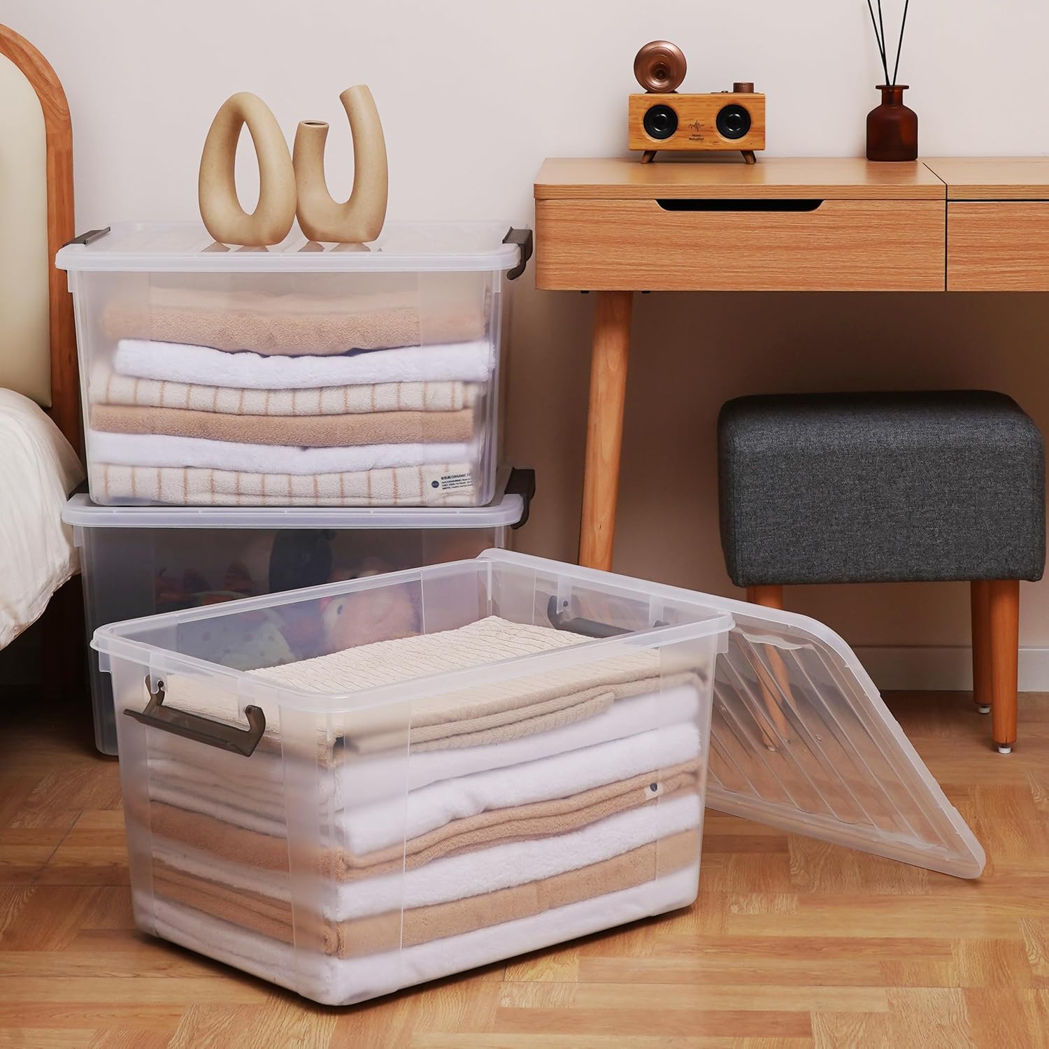 • 【69-quart Capacity】Package includes 4 containers for organizing, single measuring 23.23"L * 16.93"W * 13.39"H, capacity 69 QT. Suitable for large storage needs in the closet, garage, bedroom, basement, camping, office, etc