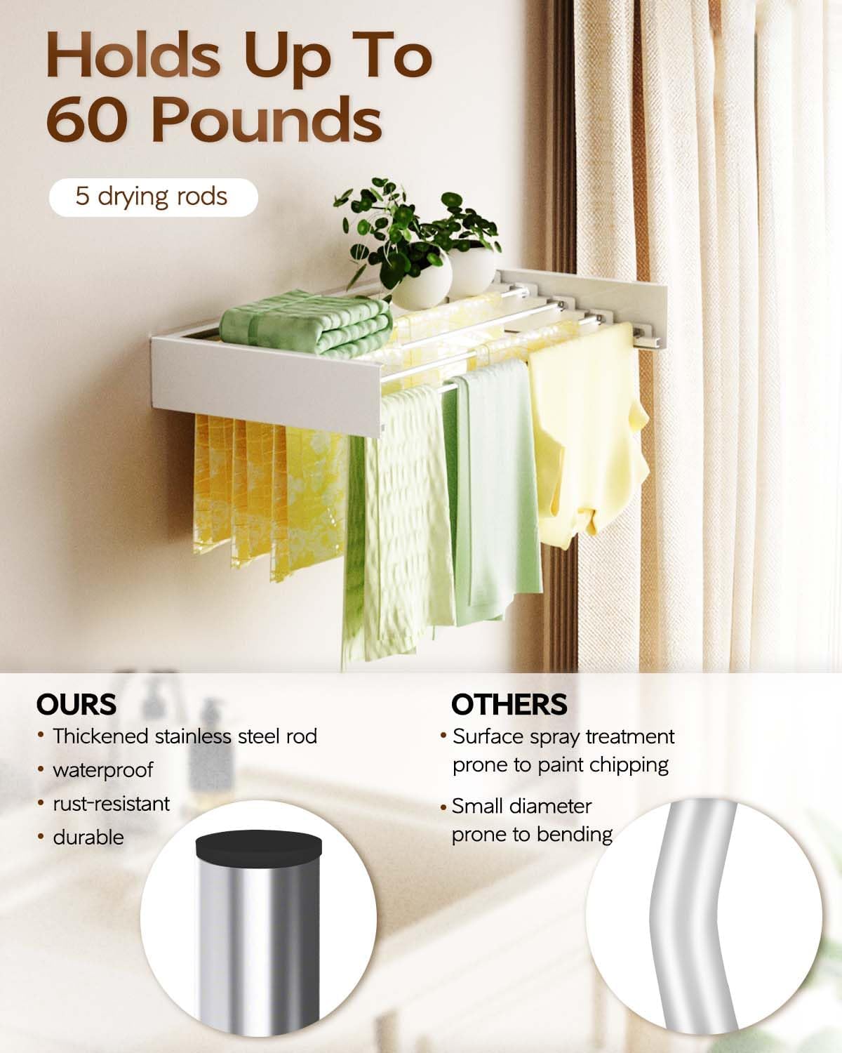 • Heavy Duty & Sturdy: 5 drying rods of the foldable clothes drying rack are made from premium stainless steel, noticeably thicker and more robust than the standard silver pipes seen in the market, without risk of bending or deformation. 40lbs Capacity. This clothes dryer rack takes up little room, but when open you can fit so much! Compact yet functional