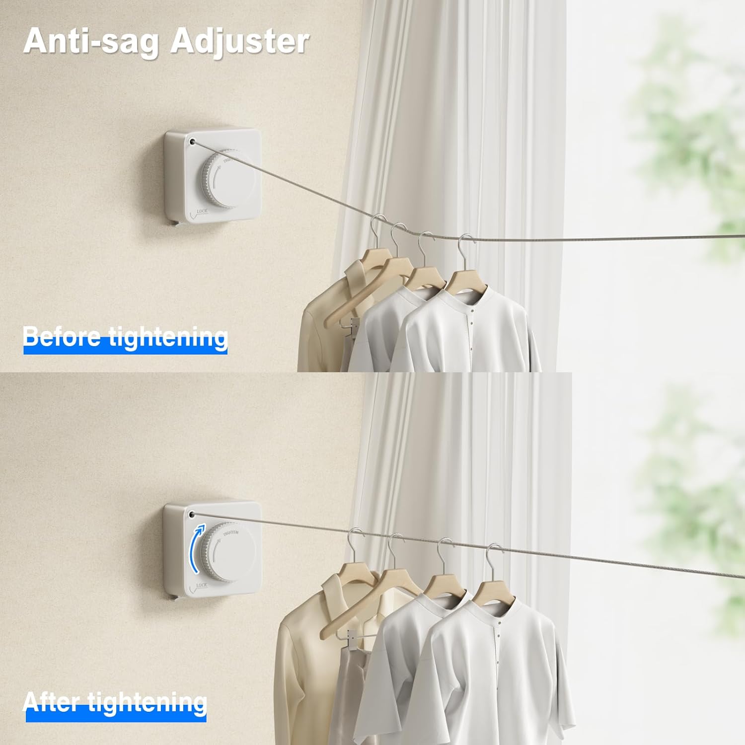 • 【Non-Sagging Design】The Retractable Clothesline is a non-sagging design, there is a locking device and a rotating tightenable device, when you hang a lot of clothes resulting in sagging, keep the locked state and then rotate to tighten the line can solve the problem of sagging. Such a very careful design is not available in others' clotheslines.