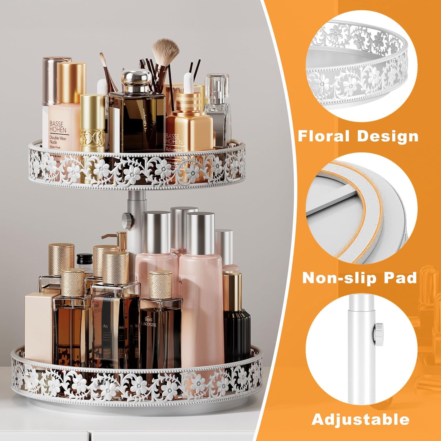 • 【Widely Used and Satisfactory Service】This spice rack organizer for countertop can be used for cabinet, kitchen countertops,sideboard storage,also suitable for dining table,bathroom,office,bedroom,living room,laundry room. The two tier lazy susan can be widely used to organize spice bottles,food jars,cosmetics,bath products,skin care products,nail polish,beverage snacks,etc.If you encounter any problems in the two tier lazy susan organizer use process, please let us know at any time, and we will provide satisfactory after-sales service within 24 hours !