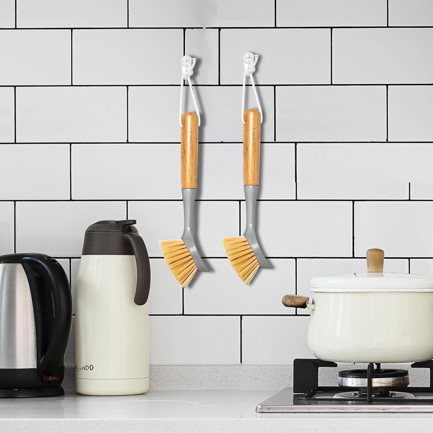 2 Pack Dish Brushes with Bamboo Handle, Kitchen Dish Scrubber Built-in Scraper, Scrub Brush for Pans, Pots, Counter & Kitchen Sink Cleaning, Dishwashing and Cleaning, Perfect Cleaning Tools, Gray